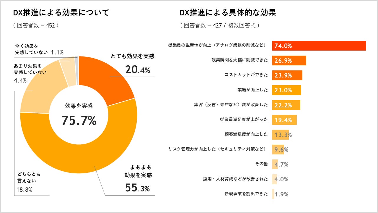 「DXに取り組んでいる/いた」と回答した人へ、DXの効果について質問したところ、「とても効果を実感している」は20.4%、「まあまあ効果を実感している」は55.3%と、合計75.5%が効果を実感。具体的な効果は「従業員の生産性が向上した」が74.0%、「残業時間を大幅に削減できた」が26.9%、「コストカットができた」が23.9%でした。
