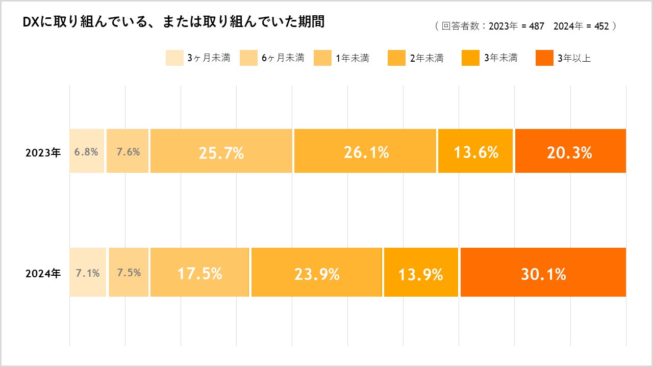 ・DXの取り組み期間は「3年以上」と回答した企業の割合が昨年と比べて約10%増加、目的は「業務効率化」「生産性向上(稼働率アップ)」「顧客満足度アップ」など