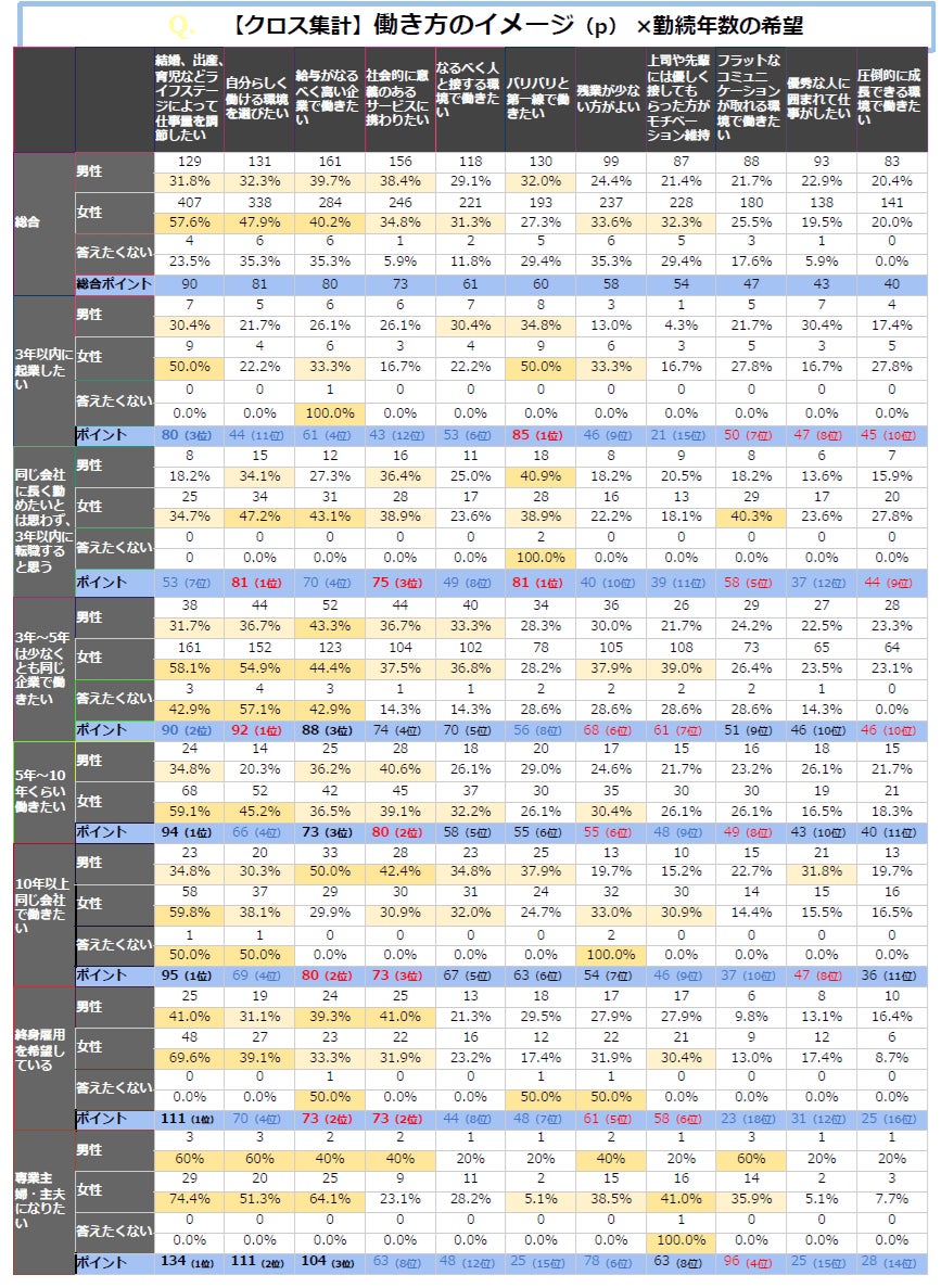 長い勤続年数を希望する男性は高い給与を求め、「社会的意義あるサービス」に関わりたい。⼥性は「ライフステージで仕事量を調整したい」