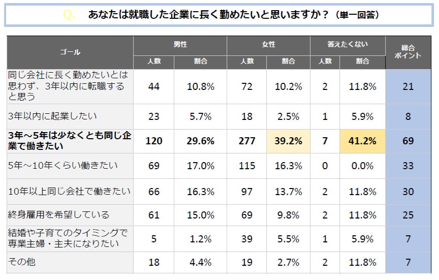 勤続年数の希望は今年も「3年〜5年」がトップ。男性のほうが保守的な傾向に