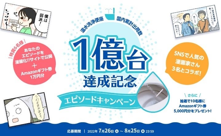 日本のトイレメーカーで組織する一般社団法人 日本レストルーム工業会(本部:愛知県名古屋市、会長:清田 徳明(TOTO株式会社 代表取締役 社長執行役員)、以下「当工業会」)では、業界の統計開始(1987年)以来、温水洗浄便座の国内累計出荷数が2022年6月に1億台を達成したことを記念し、SNSで人気の3名の漫画家、加藤マユミさん・さわぐちけいすけさん・すれみさんとコラボレーションしたTwitterキャンペーン「温水洗浄便座1億台達成記念 エピソードキャンペーン」を2022年7月26日(火)12:00から開始します。