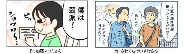 キャンペーン開始を記念し、特設サイトにて、加藤マユミさん・さわぐちけいすけさんのお二人による、ご自身の「温水洗浄便座」に関するエピソードをもとにしたオリジナルの4コマ漫画を公開しています。加藤マユミさんの作品では、家族によってそれぞれ「洗浄の強さ」の好みが違うことから起こる日常の一コマが、さわぐちけいすけさんの作品では、友人に言われて初めて温水洗浄便座を使う決意をした瞬間が、それぞれユーモラスに描かれています。
