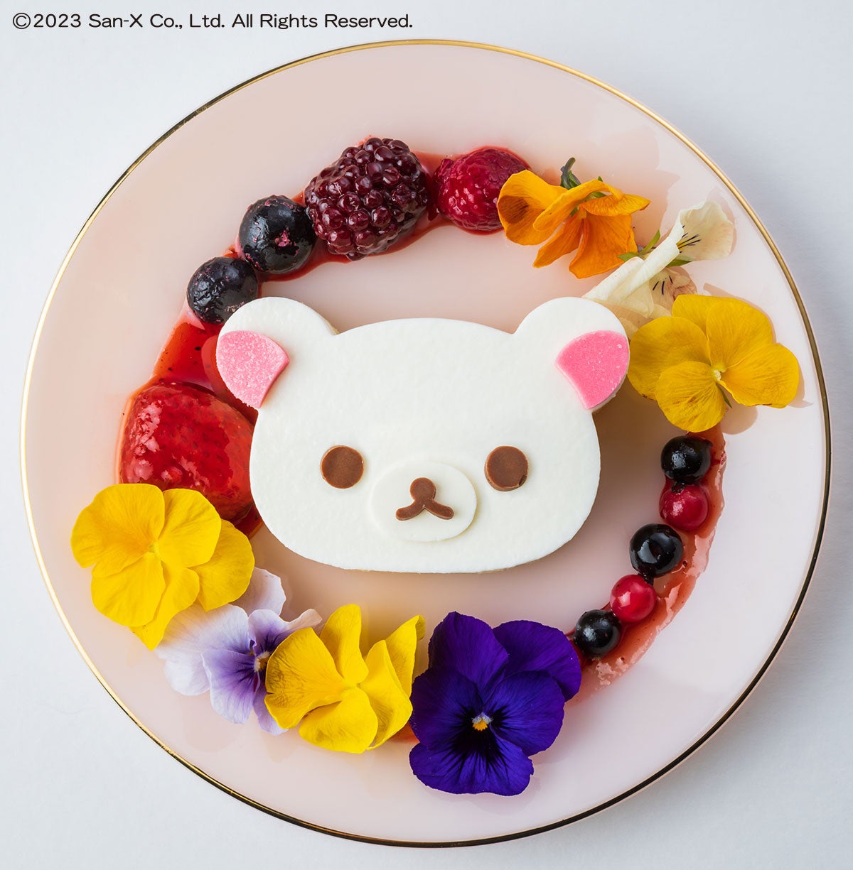 コリラックマの顔を象った白いチーズケーキを、ベリーソースとラズベリーやブルーベリーなどのフルーツ、色とりどりのエディブルフラワーで囲みました。