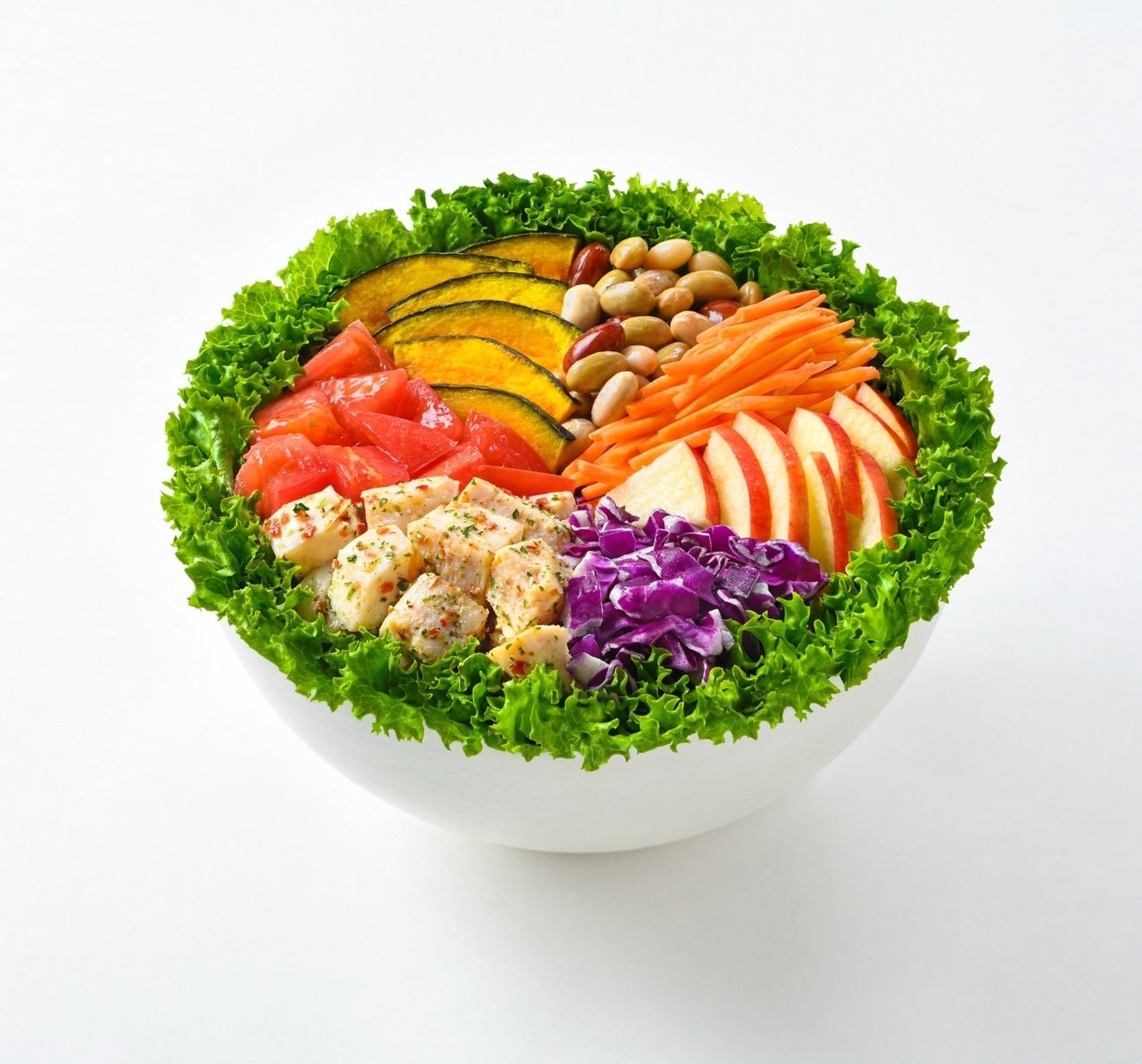 当社のサラダボウルは、日本の農家さんが大切に育てた食材を、各種野菜の特性に沿ってカットし、バランスよく組み合わせています。もっともおいしい旬の食材を使用した「シーズナルメニュー」や「本日の野菜」を用意し、季節感を大切にした四季折々の野菜の魅力を広めていきます。