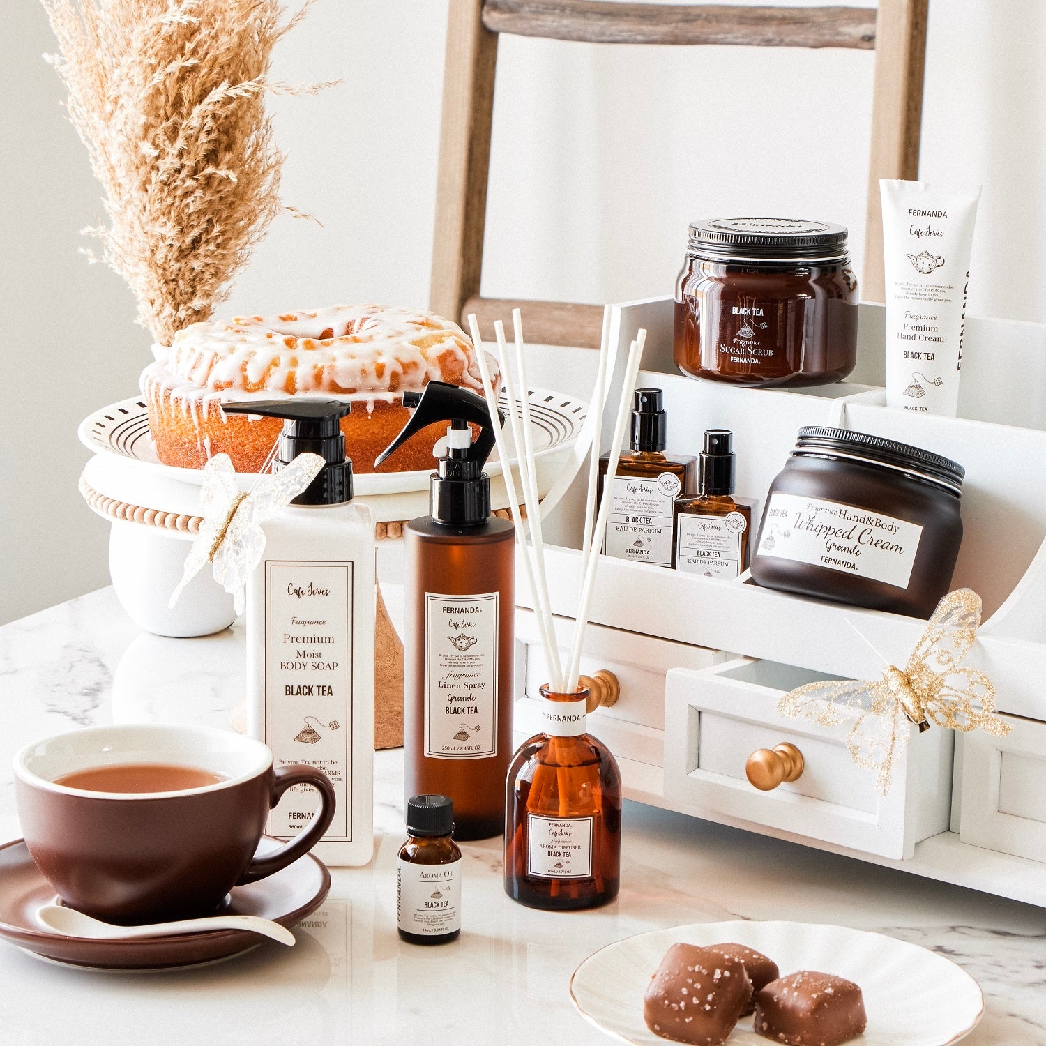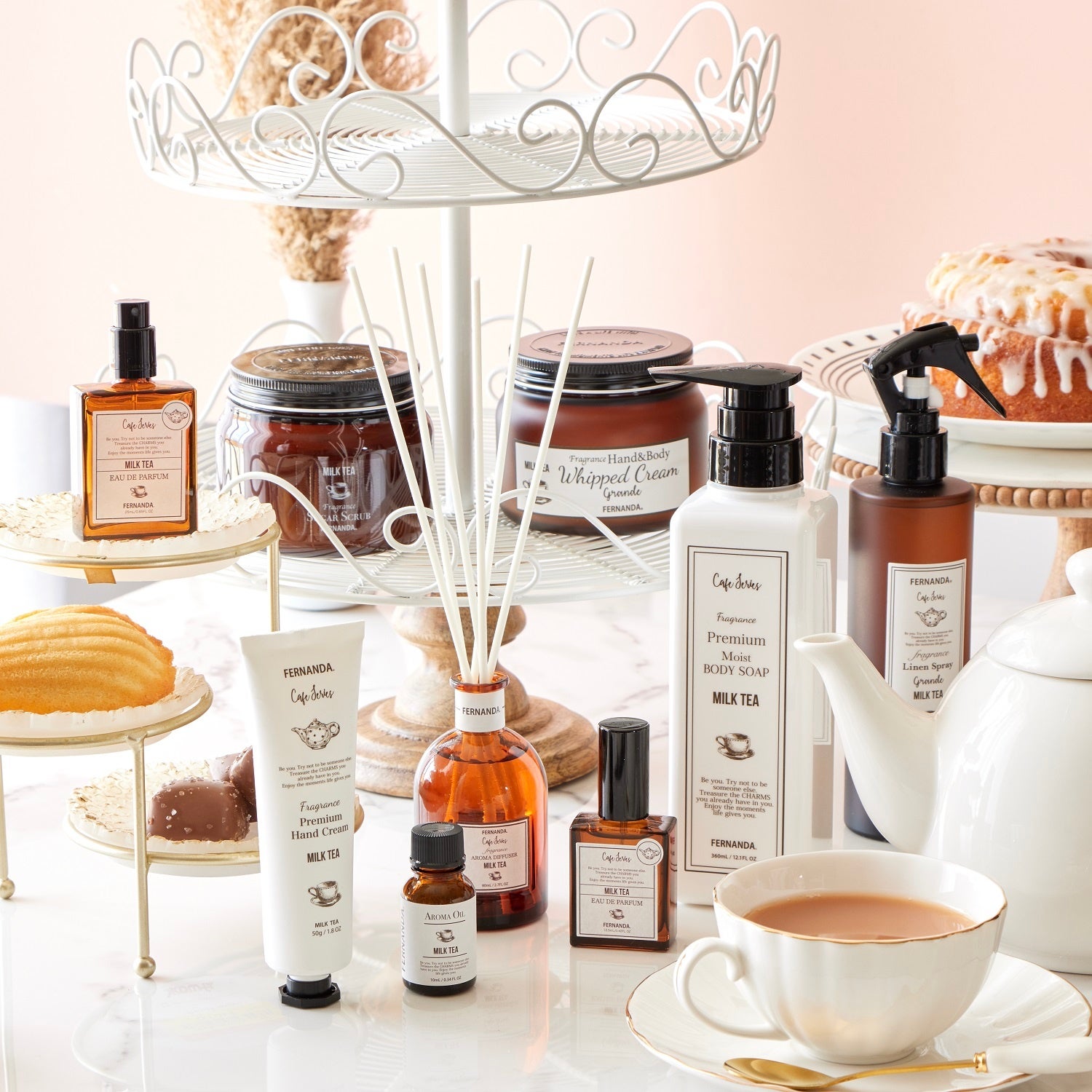 『ブラックティーコレクション』と『ミルクティーコレクション』のアイテムは、毎日身につけたいオードパルファムやプレミアムハンドクリームに加え、お風呂タイムが楽しみになるプレミアムボディーソープやボディスクラブ、お部屋でいつでも香りを楽しめるリネンスプレーやアロマオイル、ディフューザーなど幅広くラインナップ。