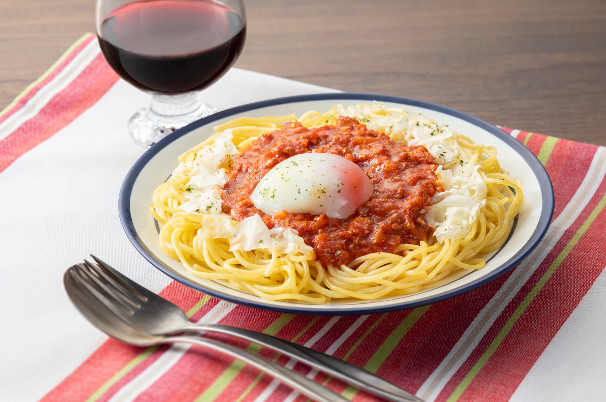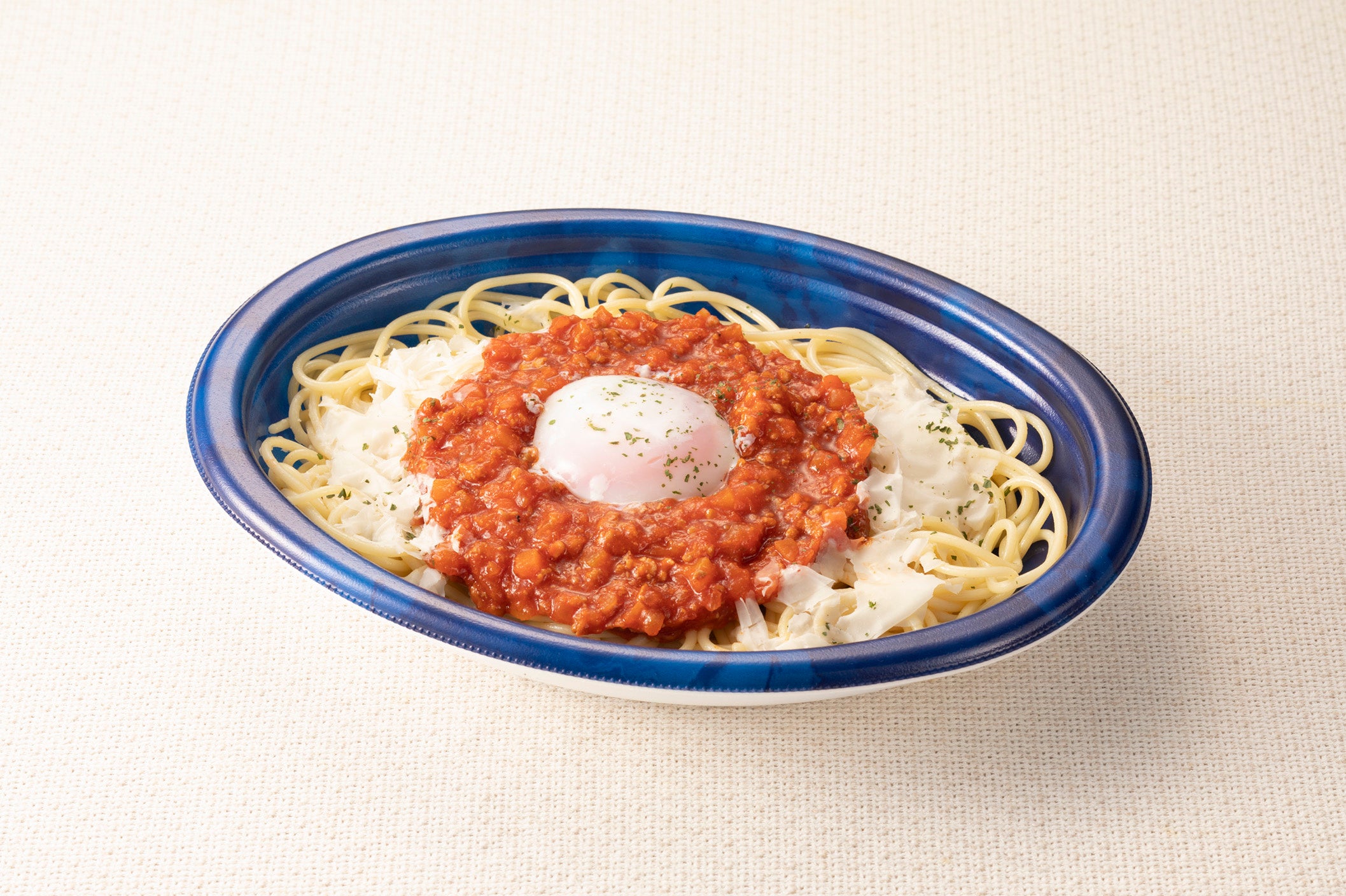 店舗で提供しているメニューをもとに開発したこだわりのミートソースです。イタリアンの調理方法“ソフリット”により香味野菜をじっくり炒め、ひき肉、赤ワインをいれて煮込むことで、野菜の旨みを増幅させたソースが特徴。薄削りしたチーズと半熟玉子をトッピングしています。