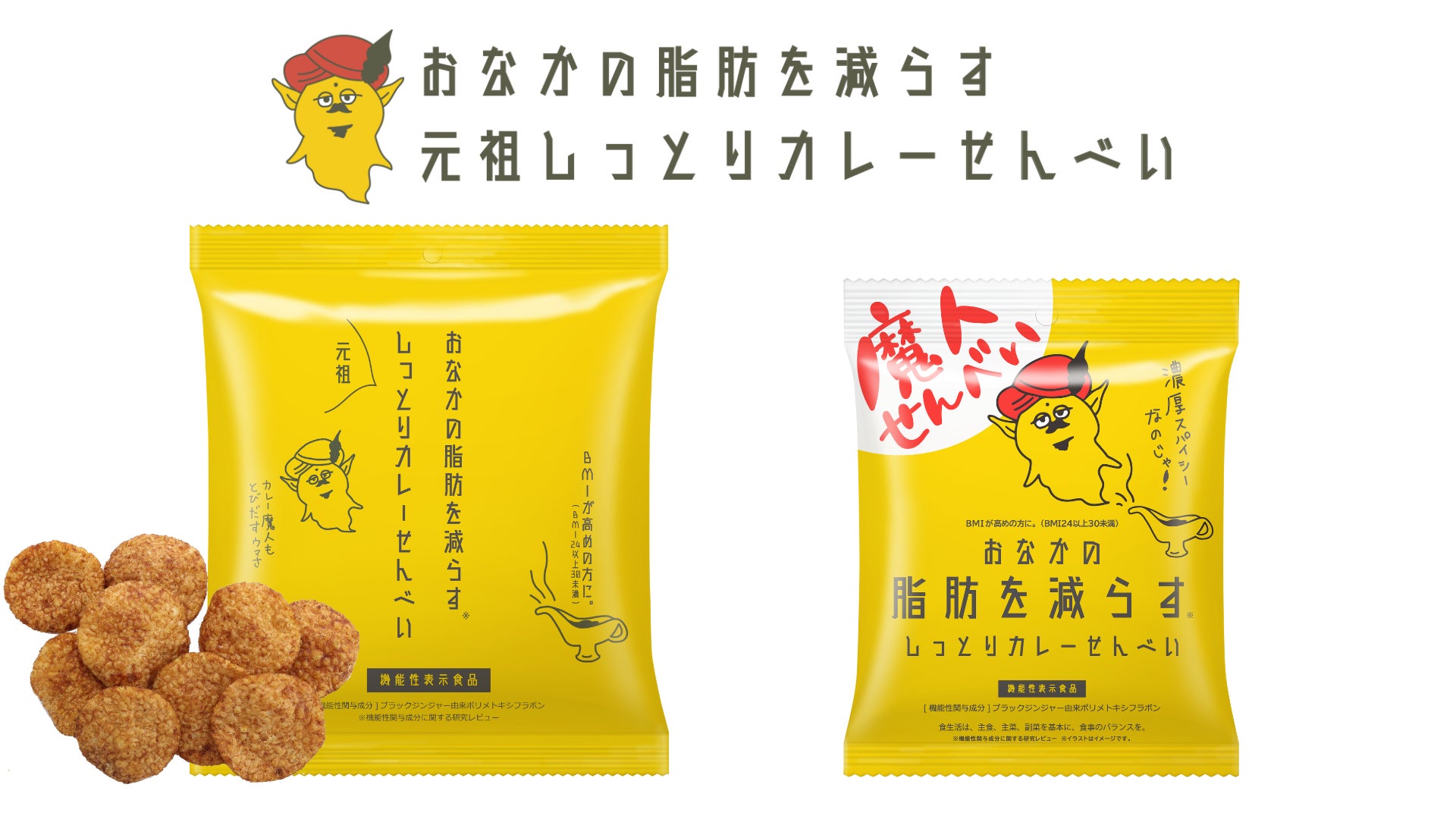 【商品概要 】 おなかの脂肪(内臓脂肪、皮下脂肪)を減らすブラックジンジャー配合の日本初*の機能性表示食品のカレーせんべい。 製法特許取得済(特許第7112789号)