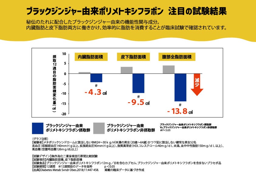 【届出表示】本品には、ブラックジンジャー由来ポリメトキシフラボンが含まれます。ブラックジンジャー由来ポリメトキシフラボンは、日常活動時のエネルギー代謝において脂肪を消費しやすくする作用により、BMIが高め(BMI24以上30未満)の方のおなかの脂肪(内臓脂肪、皮下脂肪)を減らす機能があることが報告されています。