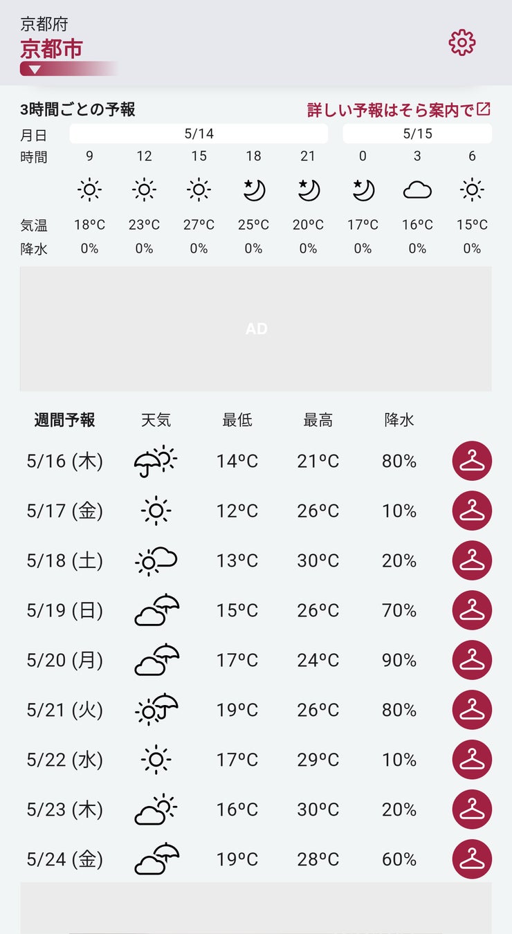 現在地あるいは任意の市区町村の10日分の天気予報(天気/気温/降水確率)