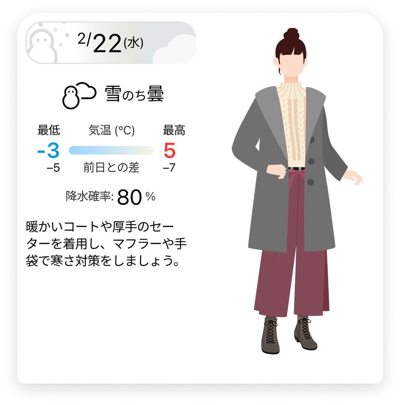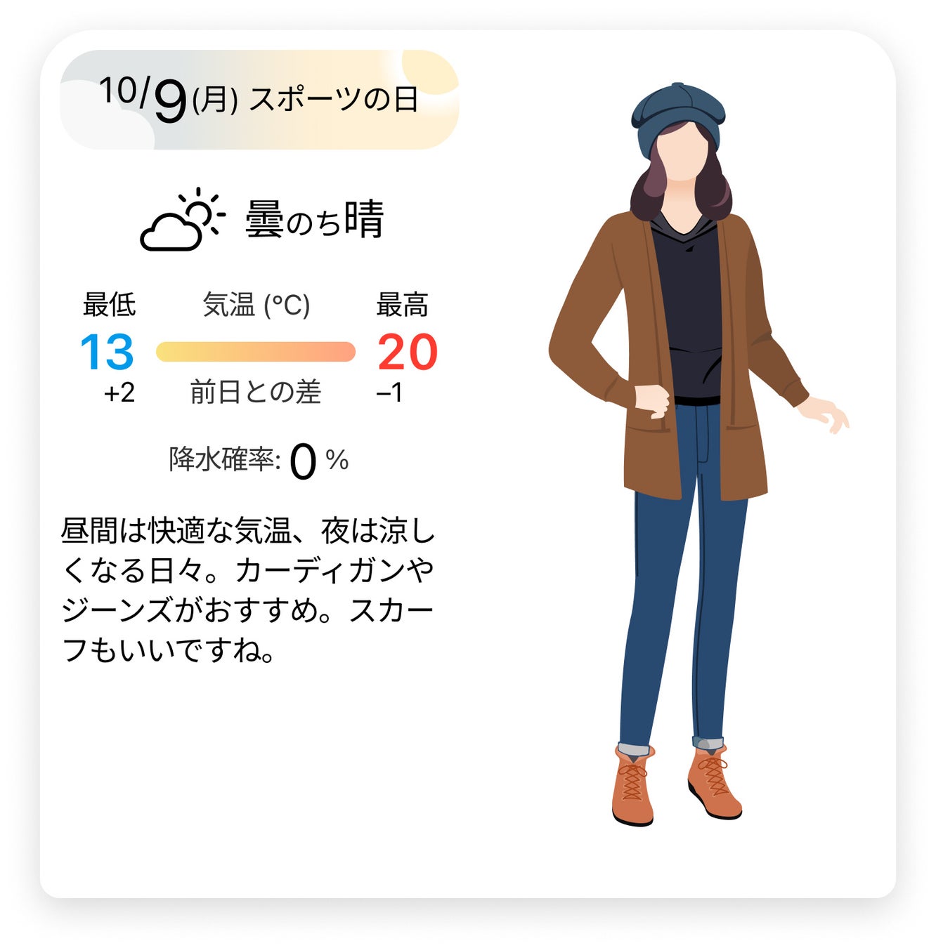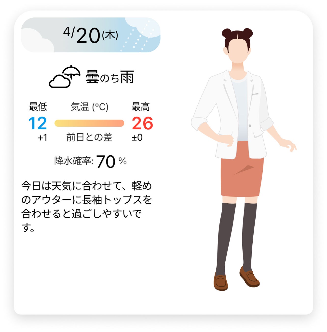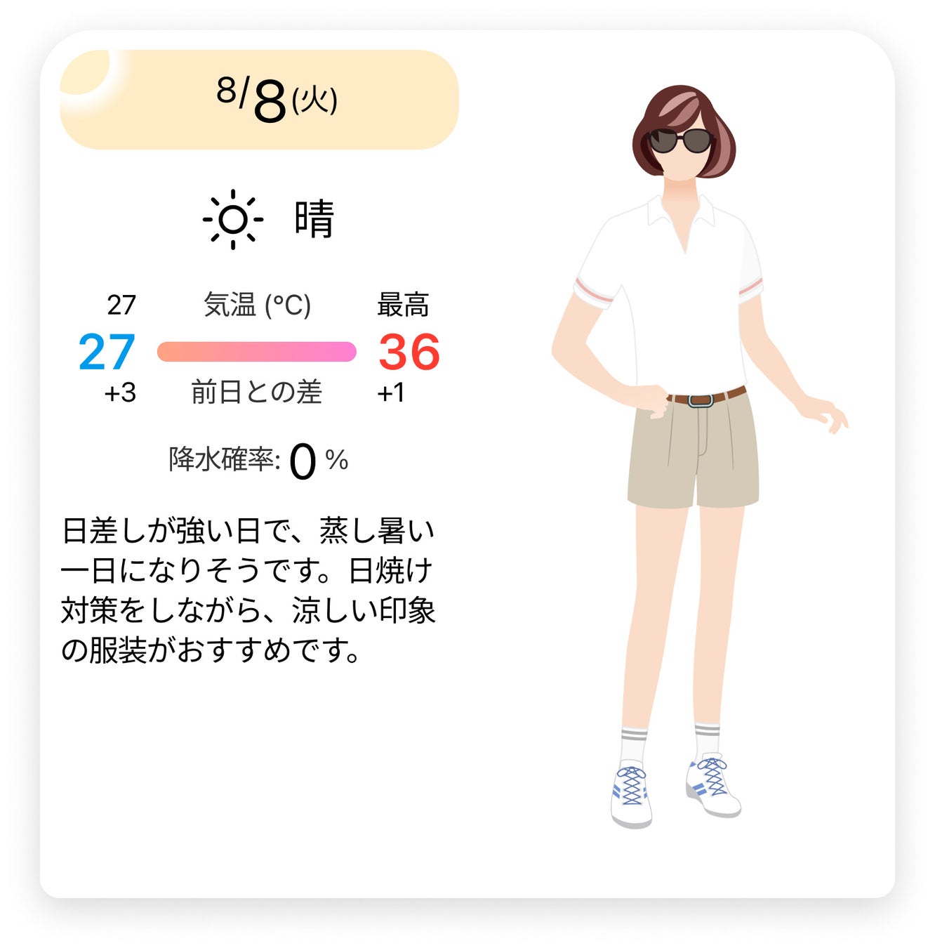 ユーザのプロフィールと日本気象協会から提供される天気予報を基に、AIがその日のコーディネートを提案します。ユーザはAIのコメントとバリエーション豊富なイラストでわかりやすくコーディネートを確認できます。別のコーディネートを見るために着替えることも可能です。