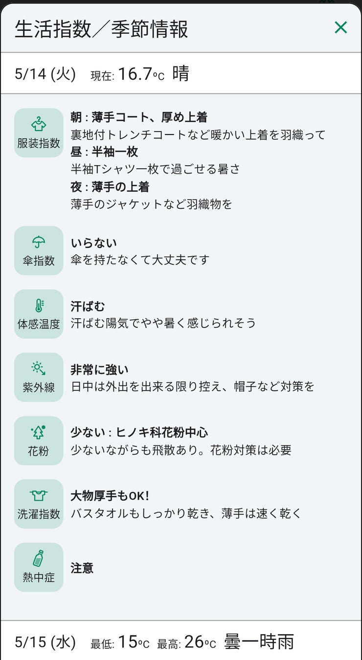 現在地や指定した地域の10日間の天気予報や直近24時間の詳細な予報、各種生活指数/季節情報など、豊富な天気情報を提供します。