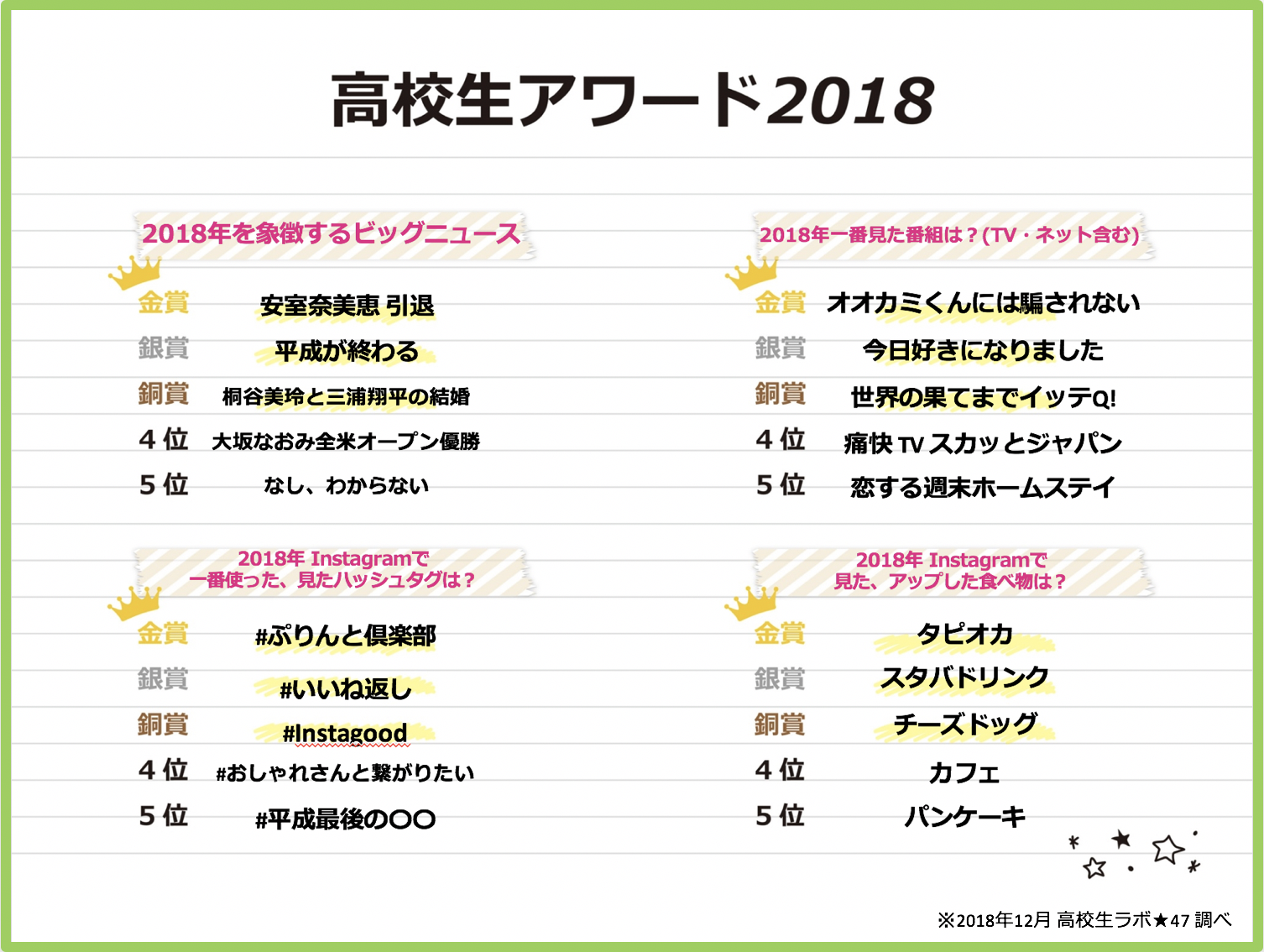平成最後の高校生1,000名が選んだ『高校生アワード2018』 発表!”タピオカ”ドリンクを飲みつつ”オオカミくんには騙されない”と意気込みながら“楽”しく“幸”せで”安室奈美恵引退”に驚いた1年間