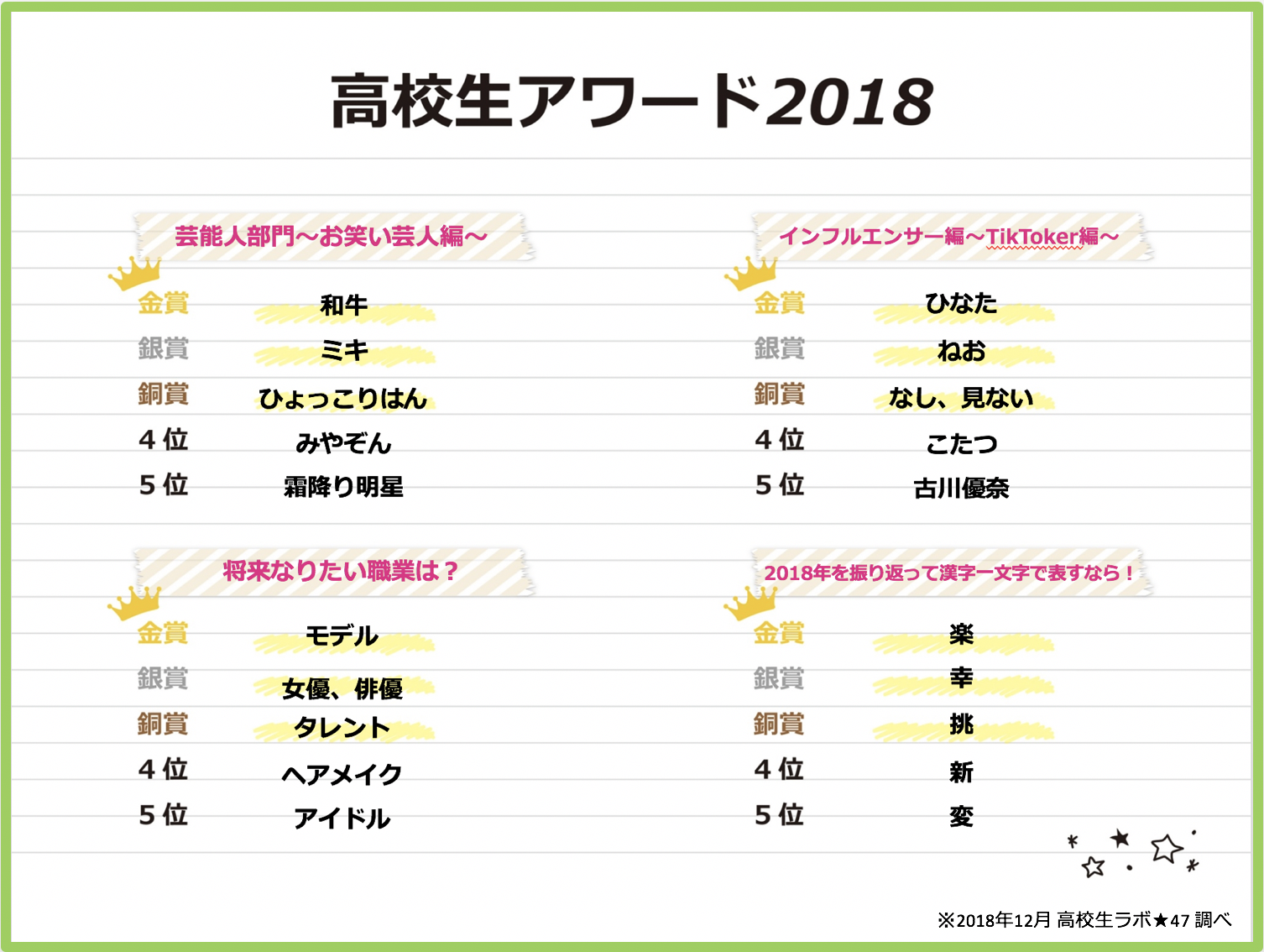 日本全国47都道府県の女子高生・男子高生ネットワーク「高校生ラボ★47」を運営する株式会社HJ(本社:東京都渋谷区、代表取締役社長:池田 隼人)は、日本全国の現役高校生1,000名を対象にアンケートを実施し、『高校生アワード2018』として発表いたします。
