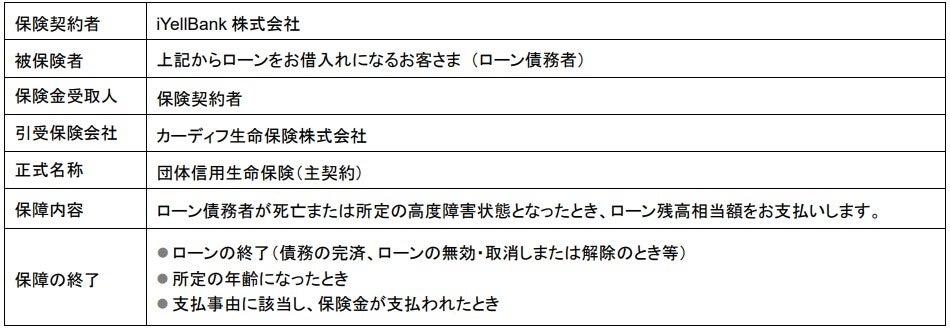 本保障は、iYellの子会社であるiYellBank株式会社(代表取締役社長 兼 CEO:窪田光洋、以下「iYellBank」)のつなぎ融資に付帯され、同融資をご利用のお客さまが死亡または高度障害状態となった場合に、融資残高を保険金としてお支払いするものです。