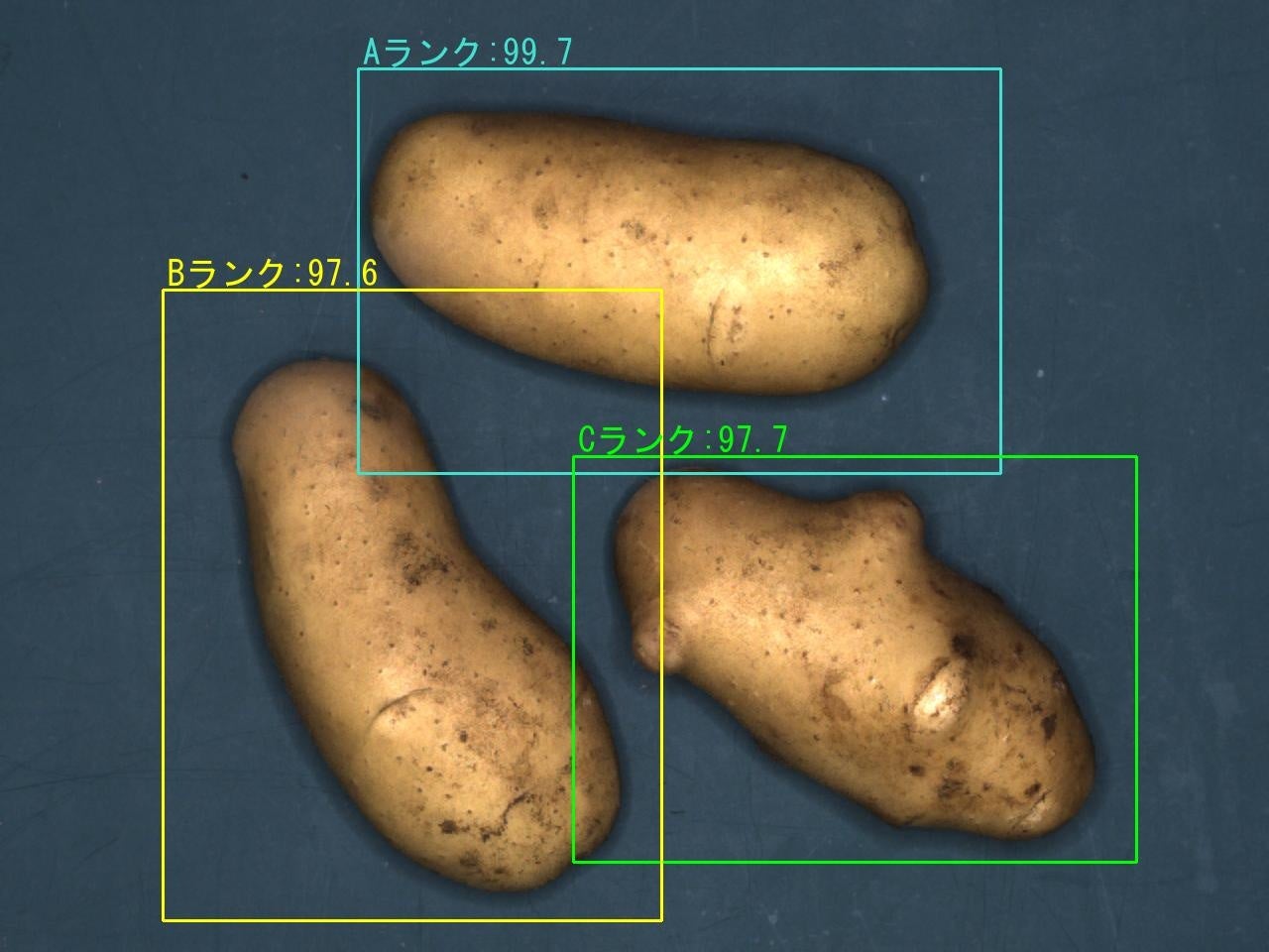 メークインを形状ごとに等級判別しています。学習のさせ方によって、サイズ・形状・色などの様々なルールで判別が可能です。認識点数が高い方を優先するといった設定もできます。
