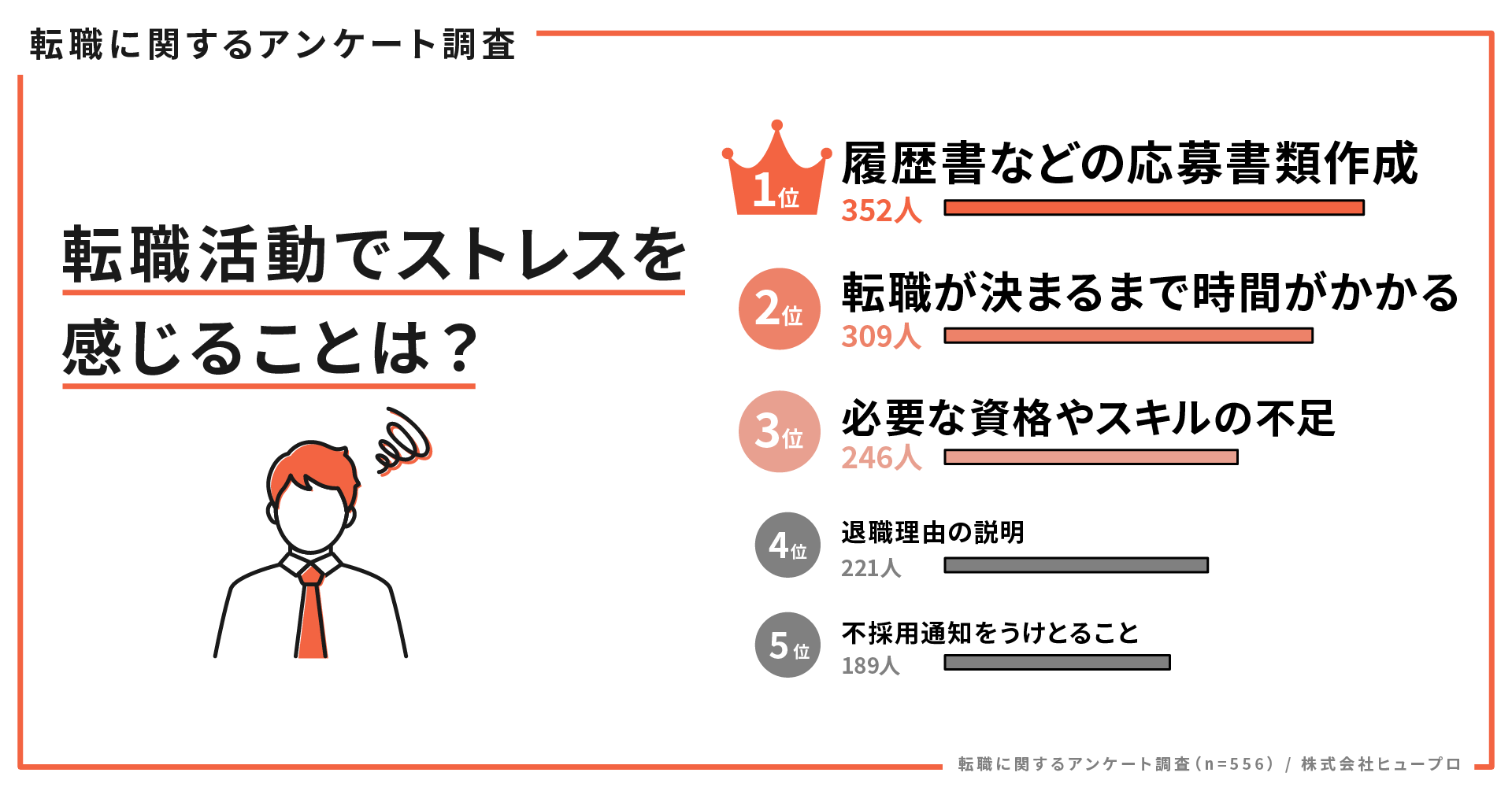 といった声も挙がりました。履歴書や職務経歴書の作成にも時間がかかるうえ、書類選考や面接を突破できず結果的に想定以上の時間がかかることで、転職活動が長期化しストレスとして大きな影響をあたえている実態が浮き彫りになりました。