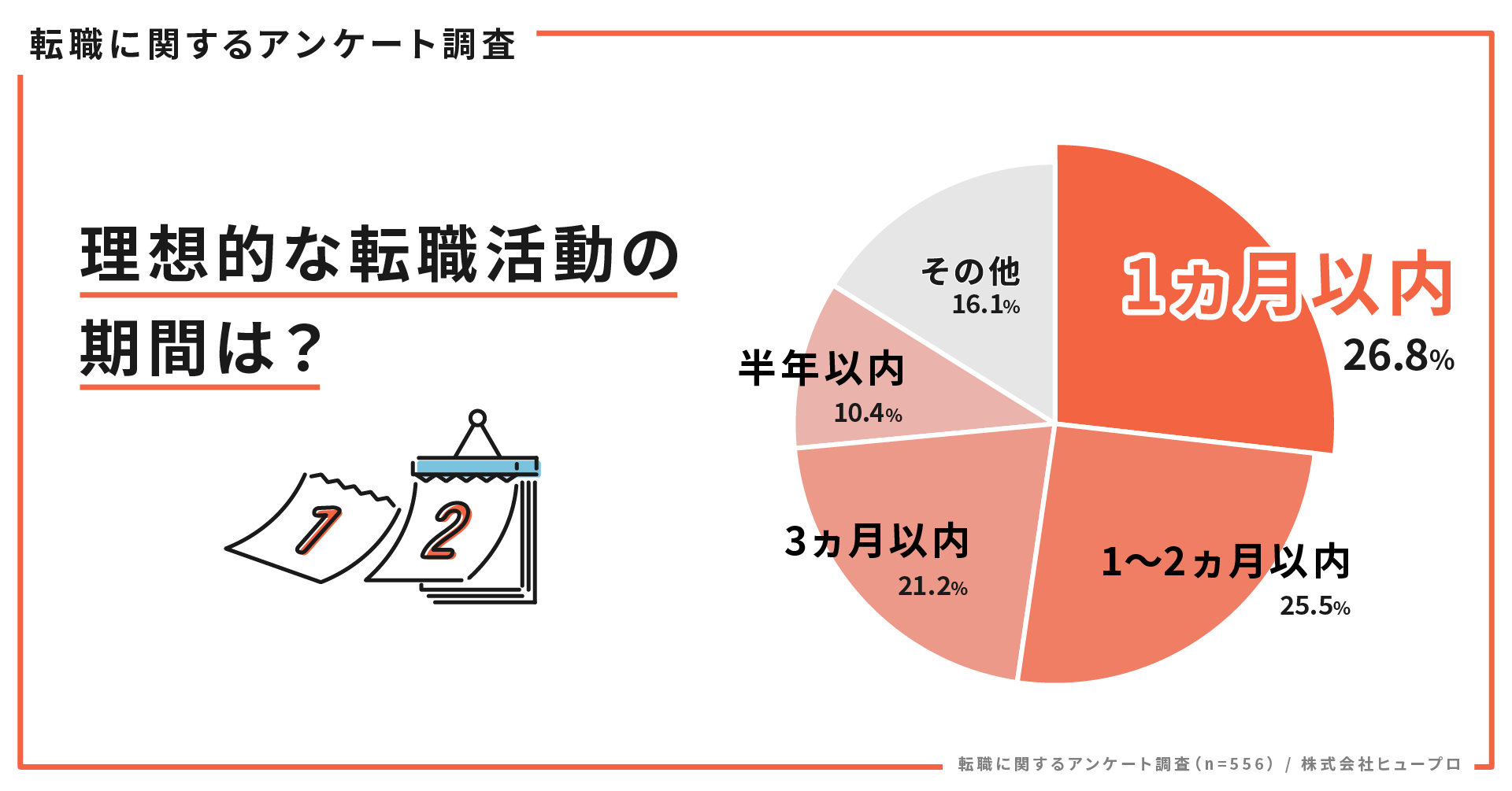 10代~60代の全国の男女556名を対象としたアンケート調査の結果、理想的な転職活動の期間は「1ヶ月以内」と回答した方が26.8%で最多となりました。「1〜2ヶ月以内」と回答した方も僅差で25.5%となり、転職を検討している人の半数以上が「少なくとも2ヶ月以内に転職先を決めたい」と考えていることが明らかとなりました。