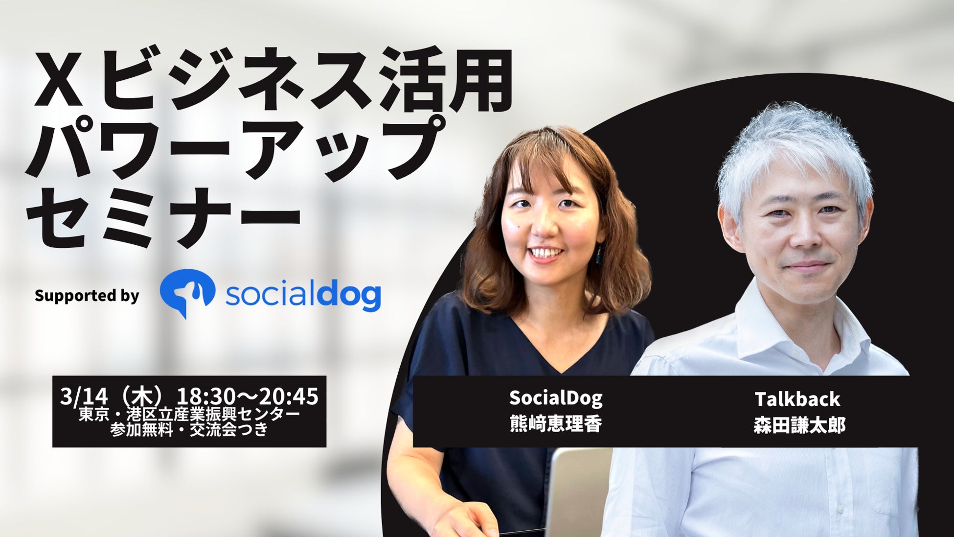 株式会社SocialDog(本社:東京都江東区、代表取締役社長:小西将史)は、2024年3月14日(木)に開催される、トークバック合同会社(本社:東京都港区、代表社員:森田謙太郎)主催の「Xビジネス活用パワーアップセミナー」に協賛いたします。