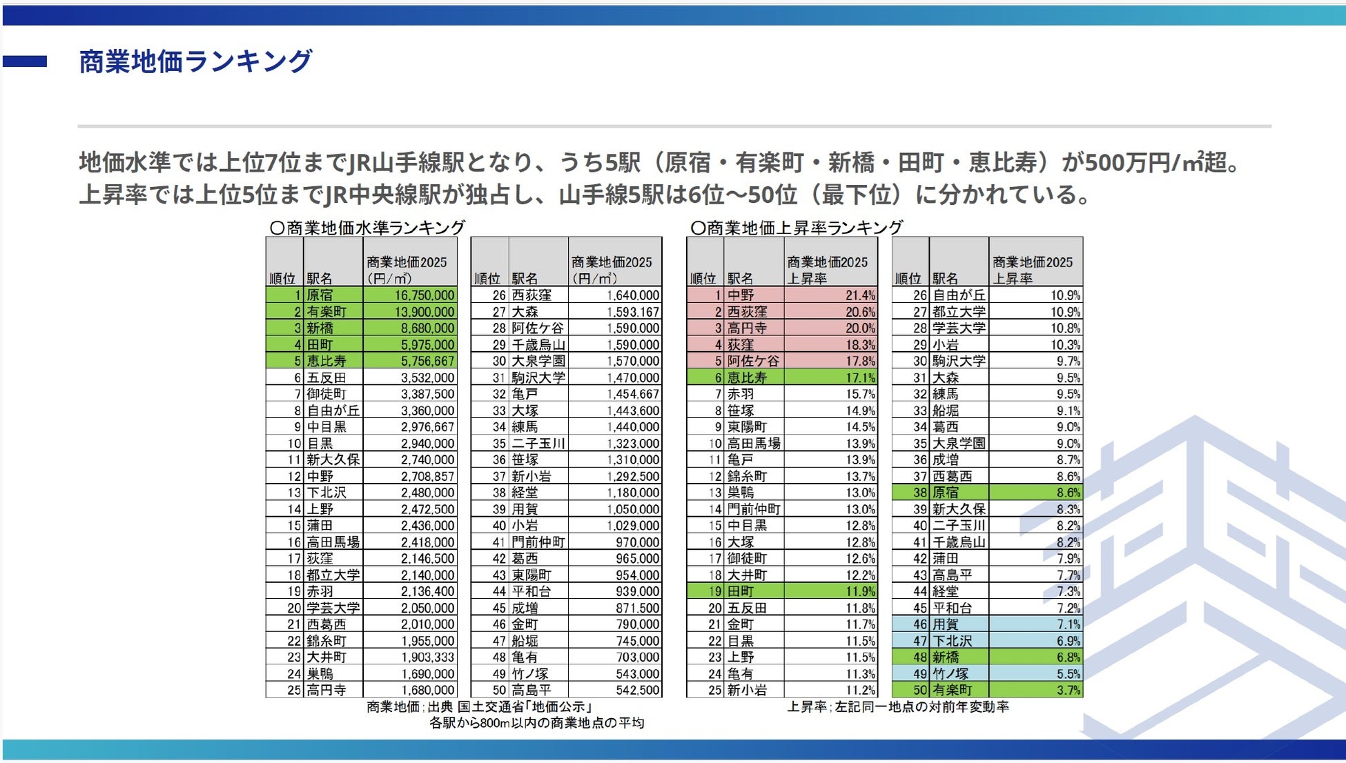 調査の結果、2025年の商業地価は、50駅すべてで上昇となっており、この背景には2024年の各駅の駅前商店街の売上増加や店舗不動産の取引の活性化が考えられるものの、地価上昇率の高低とその要因については異なる動向を示していることがわかりました。