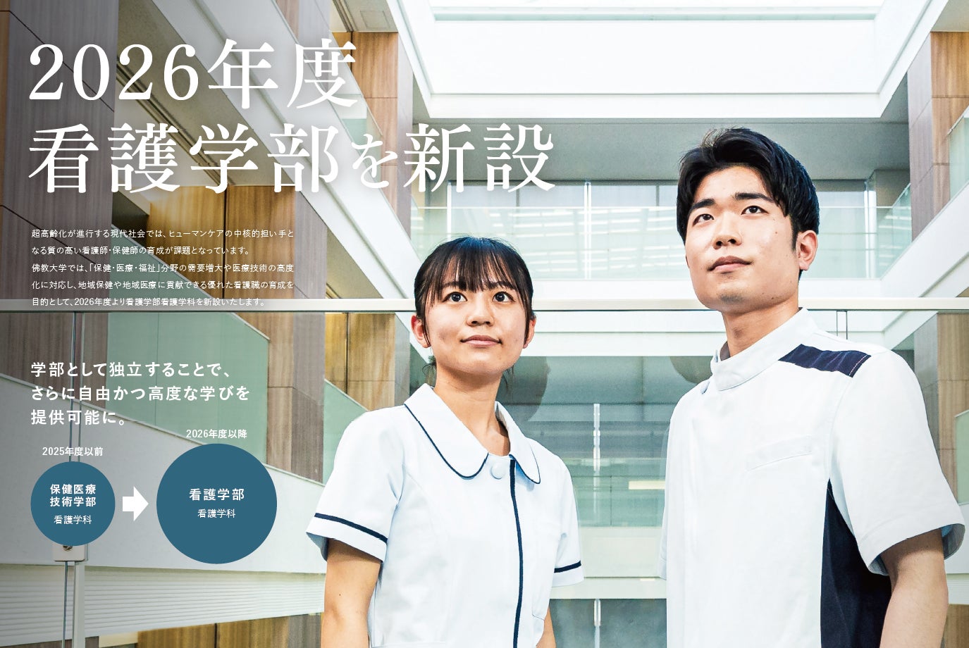 佛教大学では「保健・医療・福祉」分野の需要の増大や医療技術の高度化に対応し、地域保健や地域医療に貢献できる優れた看護職の育成を目的として、2012年に開設しました保健医療技術学部看護学科を2026年度より「看護学部」へと深化し、さらに自由かつ高度な学びを提供します。