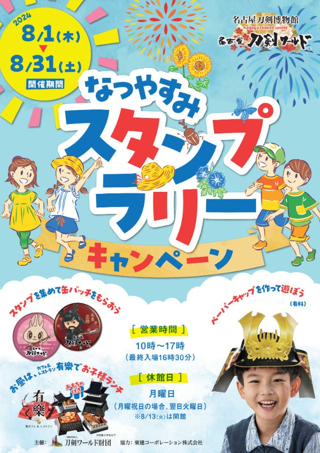 8月1日より、名古屋刀剣ワールドでは、家族みんなで楽しめる夏休みの特別イベントを開催します!注目は、「なつやすみスタンプラリー」。博物館内に隠されたスタンプを集めると、名古屋刀剣ワールドオリジナルの缶バッチがもらえます。 また、本館2階ロビーでは、兜をテーマにしたペーパーキャップ作り(有料)を体験することが可能です。全5種のデザインから好きなものを選んで、お気に入りの兜を作りましょう。
