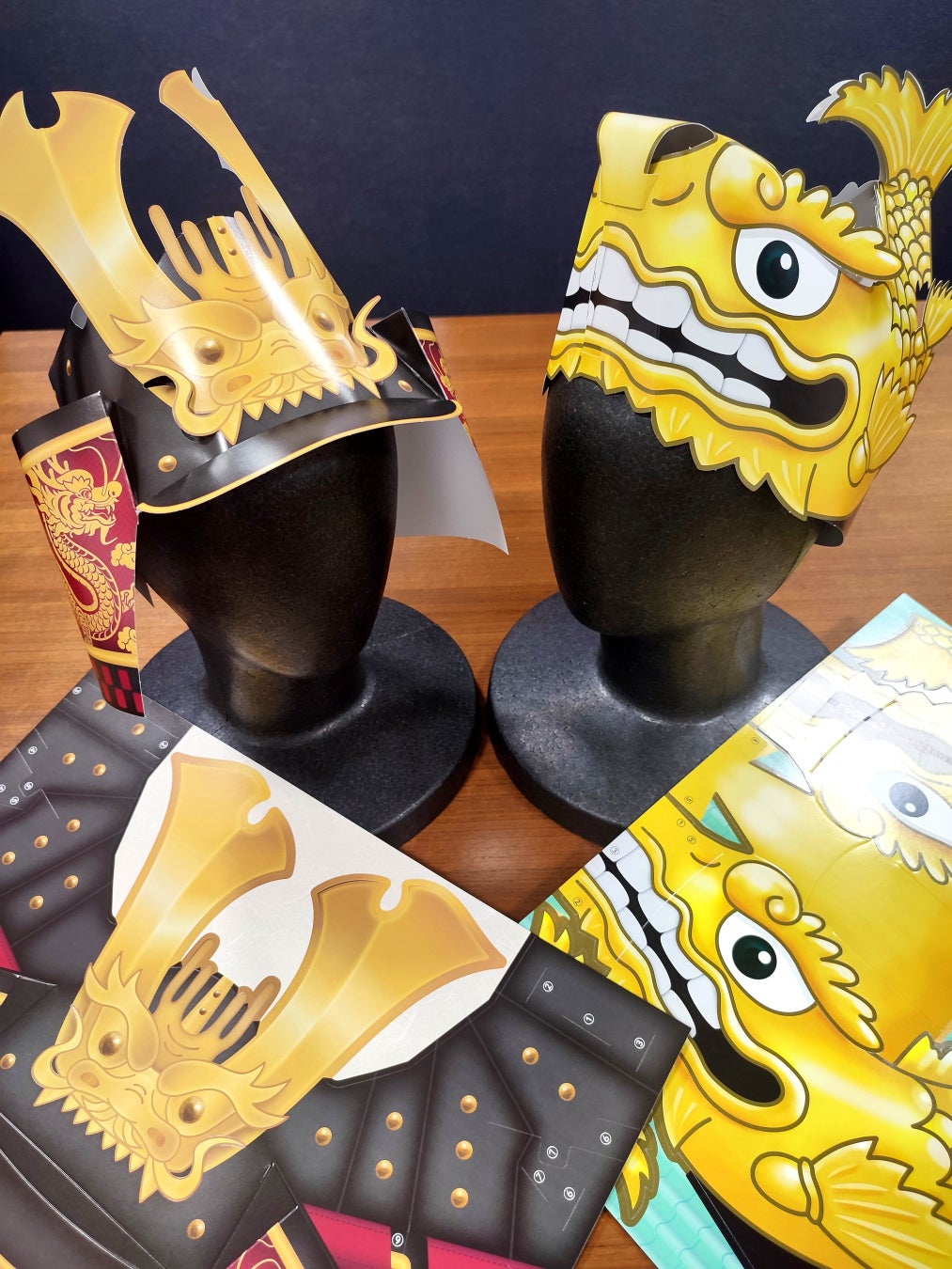 1枚の紙から、道具を使わずに簡単に作ることができるペーパークラフトで、完成すると兜や金シャチの形をした帽子になります。(※お子様向けサイズです。)