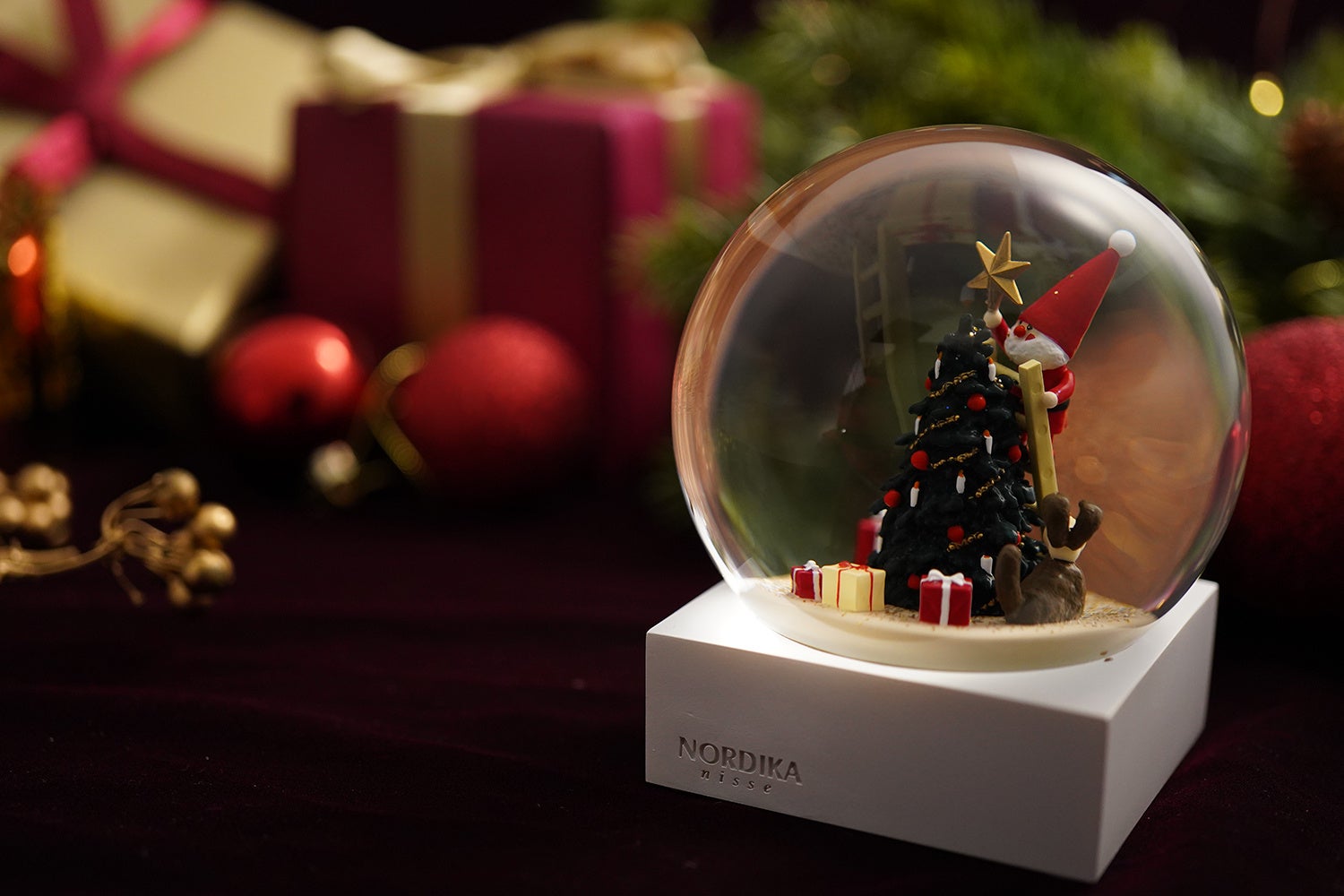 クリスマスが近づく頃、ニッセは小さな相棒の犬と一緒に、お部屋の中でツリーの飾り付けをしています。犬はオーナメントやキャンドルをニッセに手渡し、ふたりはついに星をツリーのてっぺんへ。ニッセと犬は願いました。「世界中に、あたたかなクリスマスが届きますように。」そんなふたりの優しい願いと、心あたたまるひとときを、スノードームにそっと閉じ込めました。