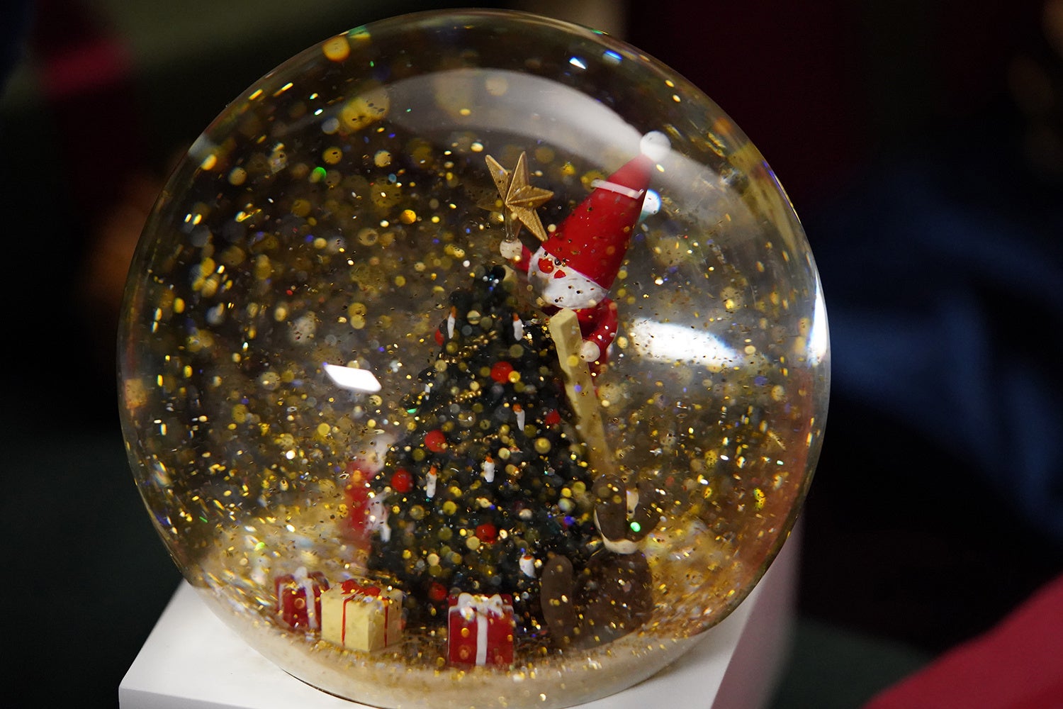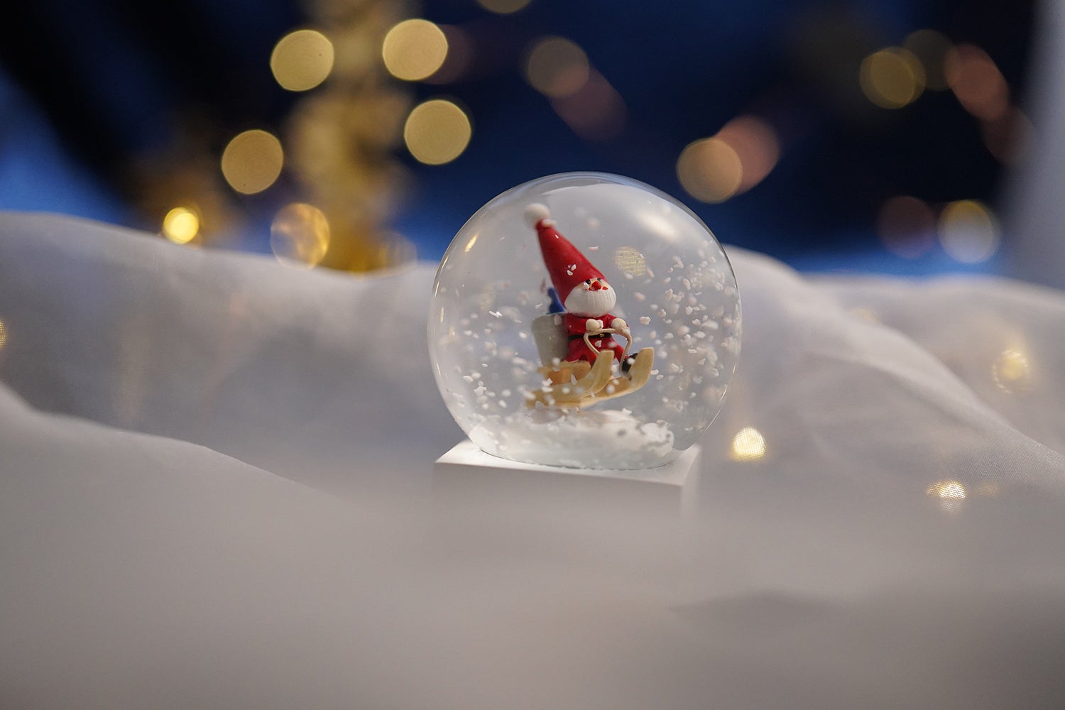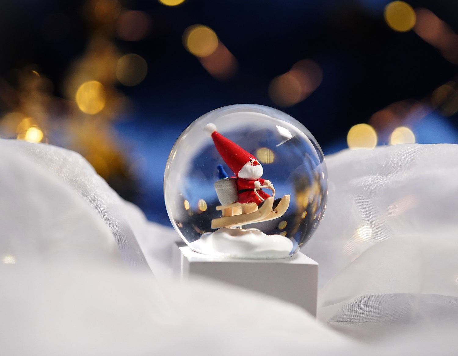 そりに乗ったニッセが雪の中へ飛び立つ瞬間を閉じ込めた、ミニサイズのスノードーム。