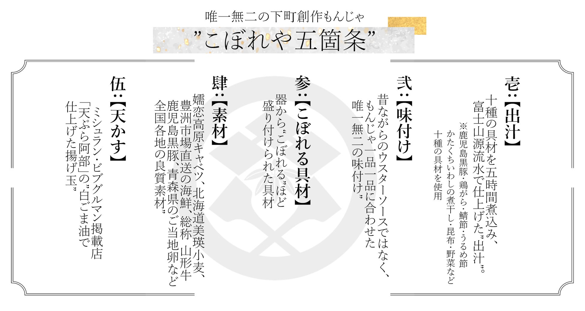 「こぼれや五箇条」は、創業以来「こぼれや」が大切にしてきた“唯一無二の下町創作もんじゃ”の哲学を言語化したものです。出汁・味付け・盛り付け・素材・揚げ玉、そのすべてにこだわりを込め、“「こぼれや」でしか味わうことのできない豪快さと上質の矛盾を楽しんでいただきたい”という想いを五つの原則にまとめました。