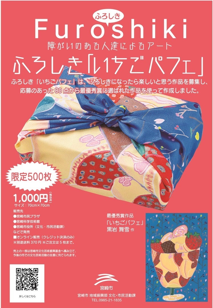 宮崎市は、障がいのある人の文化芸術活動の充実を図る取り組みとして、障がいのある人からアート作品を募集し、最優秀賞作品をモチーフに風呂敷を製品化し販売する「Furoshikiデザイン大募集」を行いました。令和5年2月1日から、最優秀賞作品「いちごパフェ」のふろしきを販売開始しました。