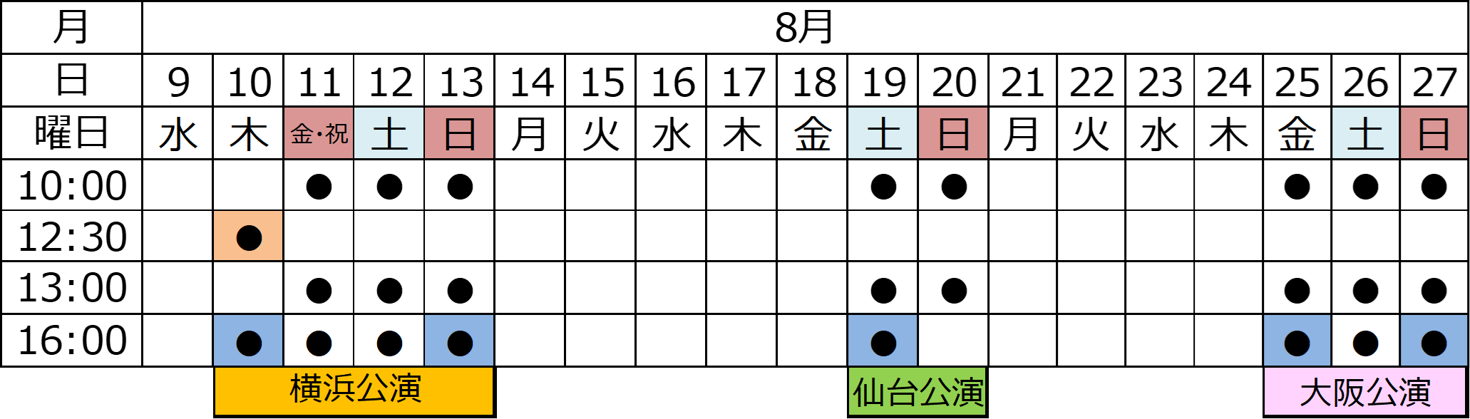 赤枠中黒…オープニングセレモニー公演(公演前に開幕イベントがございます)