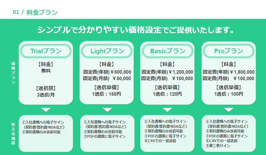 そこでこの度、新たに低コストでスタートでき、従業員の契約更新時のみの電子化ツールとして使える『契約更新プラン』をスタートいたします。無料のトライアルプランから、使える機能の数によって費用が変わるライトプラン、べーシックプラン、プロプランの計 4 つのプランをご用意し、各企業の電子化の導入を支援します。