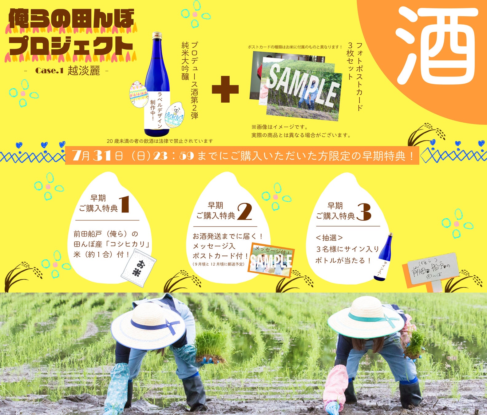 7月31日23:59までのお酒ご予約でもれなく前田船戸(俺ら)の田んぼ産「コシヒカリ」米(約1合)付!お酒発送までに届くメッセージポストカード付やサインが当たる早期購入特典満載です。