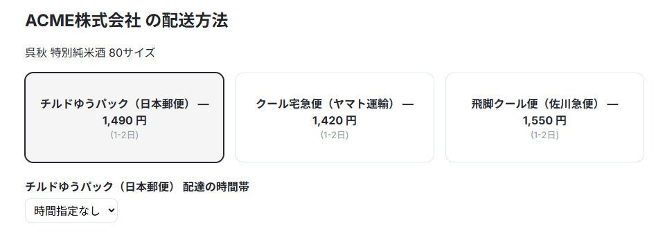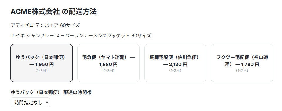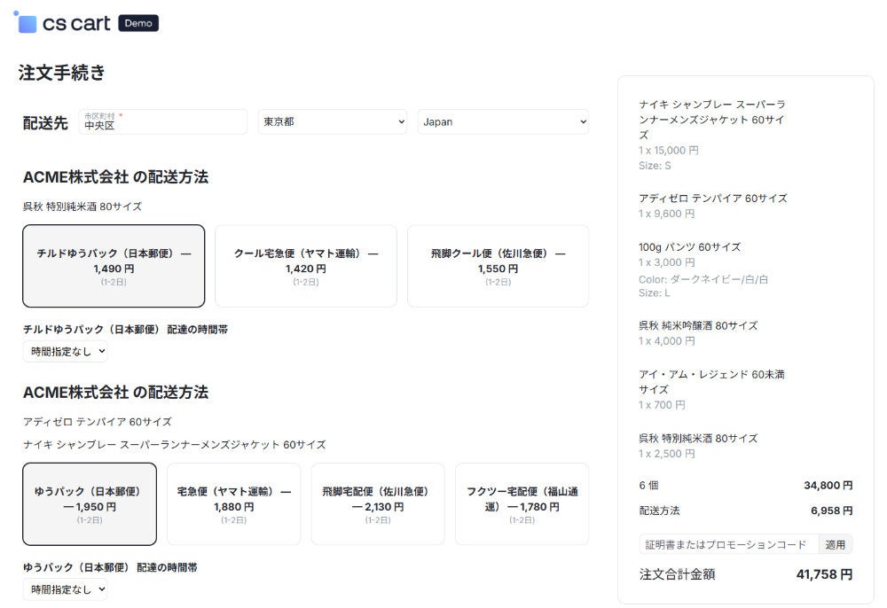 注文手続き画面では、カート内商品の条件に基づき利用可能な配送方法が自動でフィルタされてグルーピングが行われます。