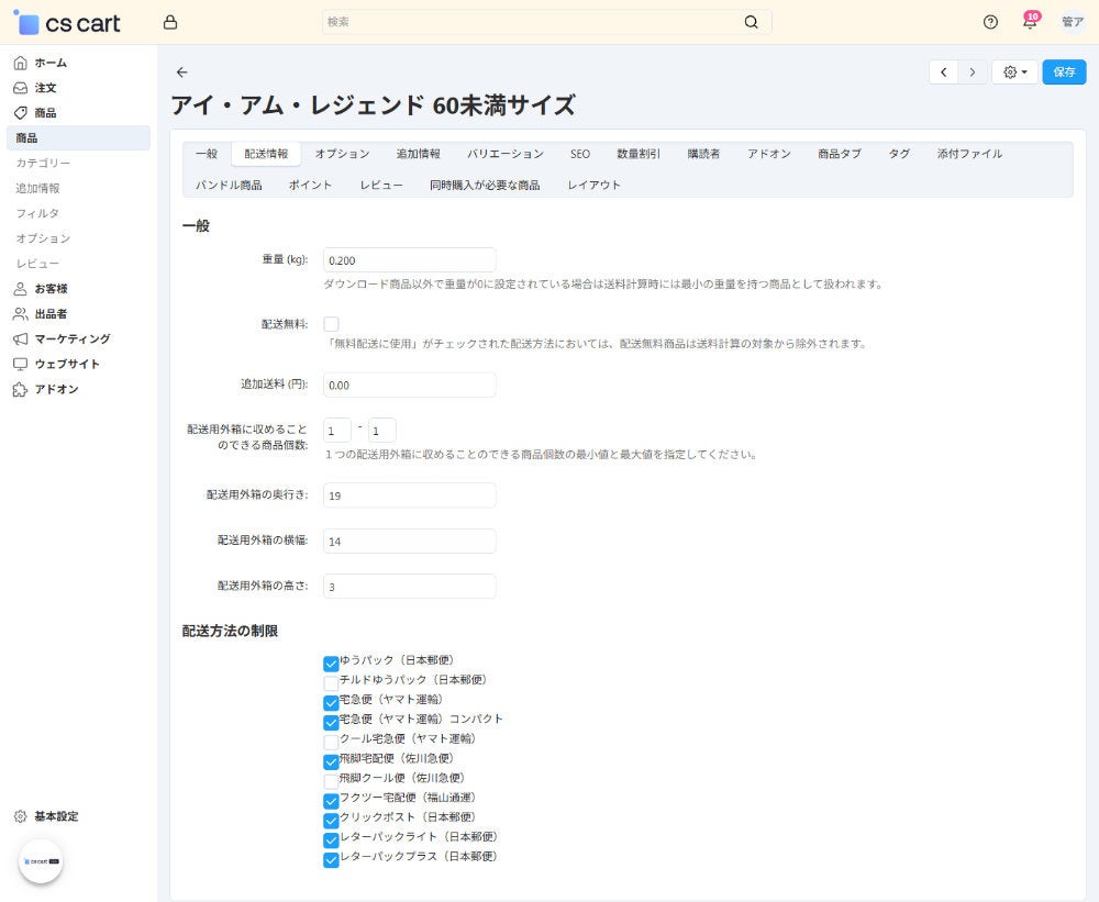管理画面の「商品 > 商品編集 > 配送情報」タブにある配送情報設定では、商品の重量、配送用外箱の奥行き、配送用外箱の横幅、配送用外箱の高さに加え、「配送方法の制限」で当該商品の利用可能な配送方法を指定できます。