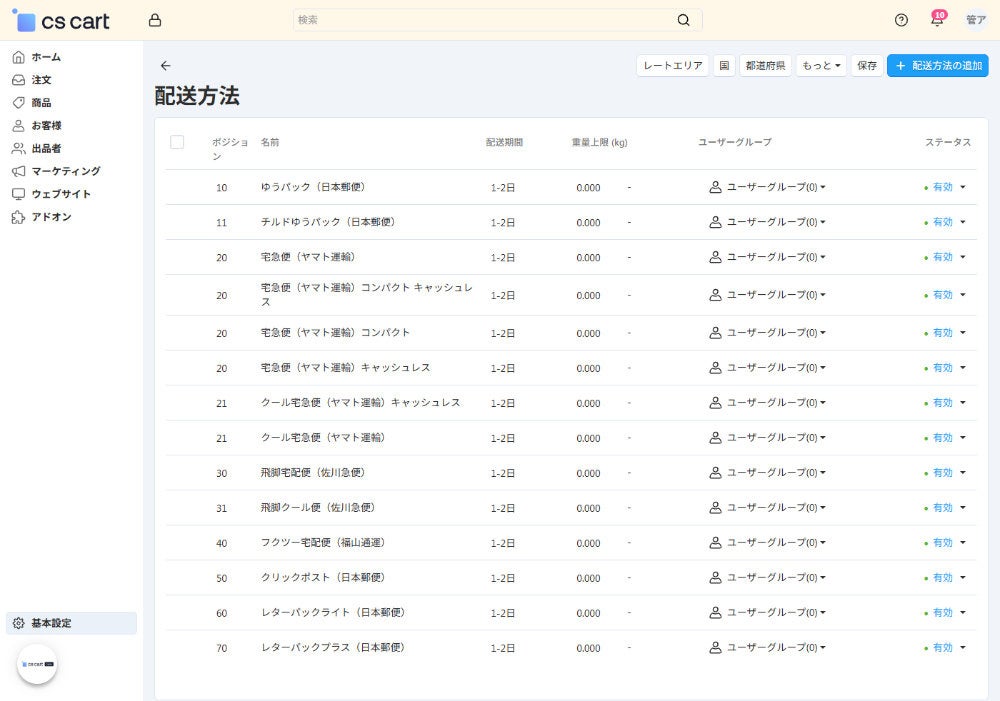 管理画面の「基本設定 > 配送方法」では、マーケットプレイス全体で利用する配送方法を指定できます。