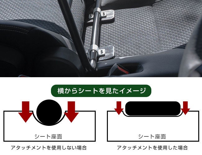 そこで、シートへの凹みを軽減・分散できる座席専用アタッチメントを独自に発案し、開発しました。