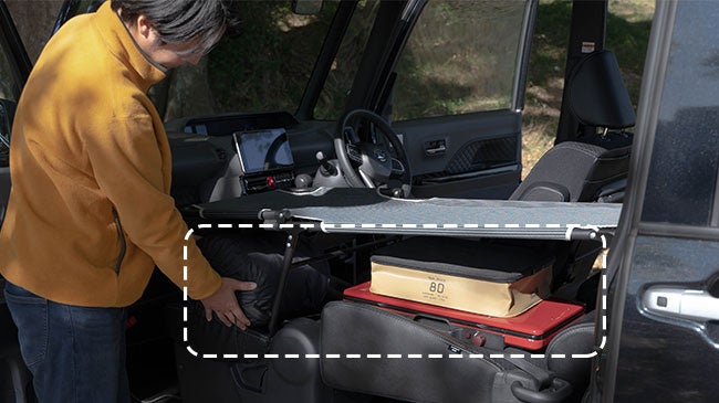 シートの上にベッドを展開し設置するだけで、真っ直ぐ眠れる空間を実現できる様になりました。