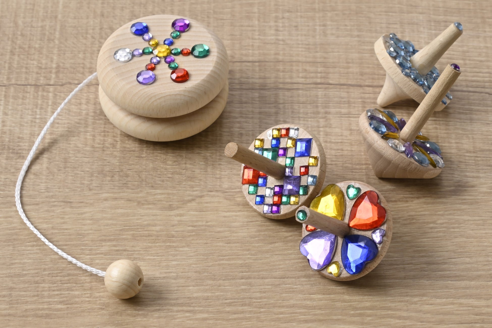ドイツのベック社で作られている上質な木のおもちゃにキラキラ装飾を貼って自分だけのオリジナルコマをつくります!