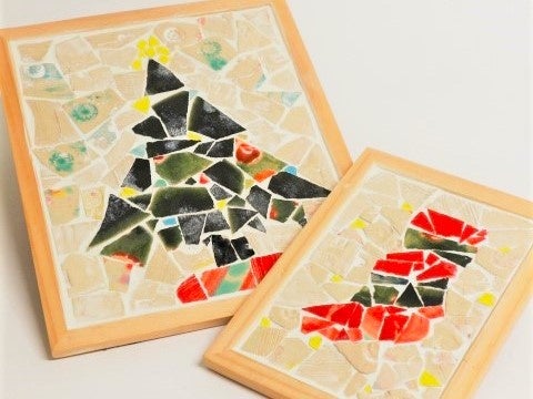 色とりどりのクラッシュタイルを貼り付けて絵を描き、クリスマスに飾れるタイルフレームを作りませんか。