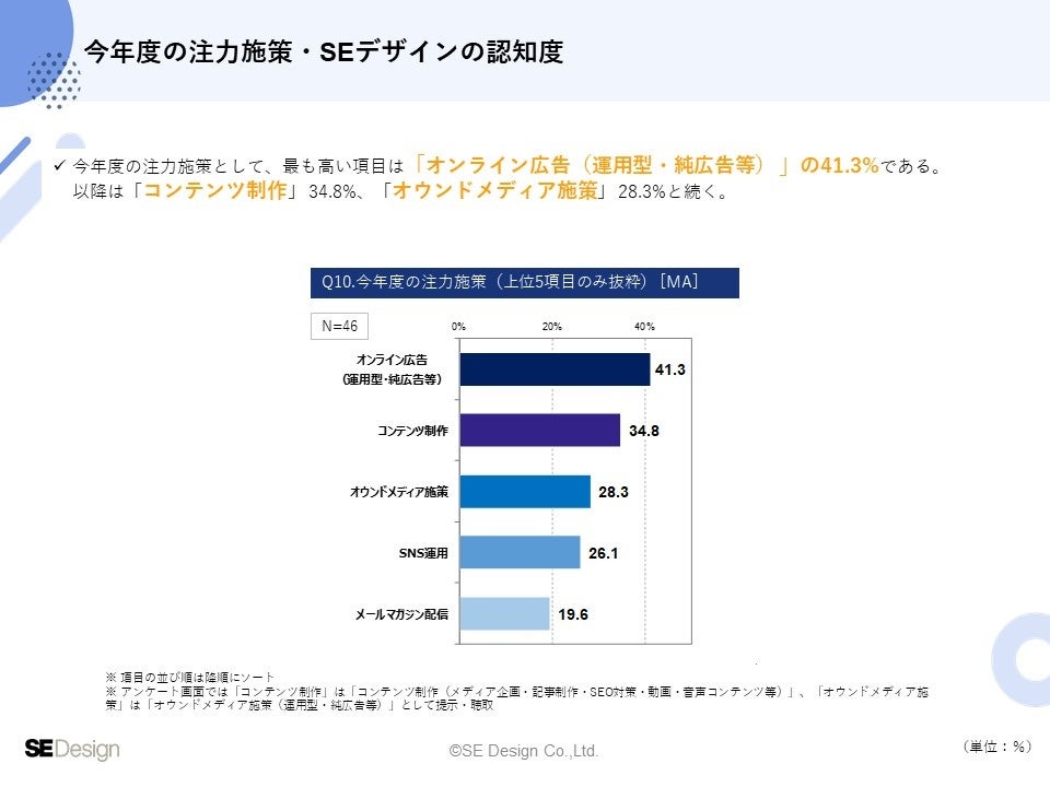 「Q10.今年度実施予定、もしくは実施中の施策の中で、注力している、する予定の施策を3つまで選んでお知らせください。(複数回答)」(n=46)と質問したところ、「オンライン広告」という回答が最も多く、41.3%でした。