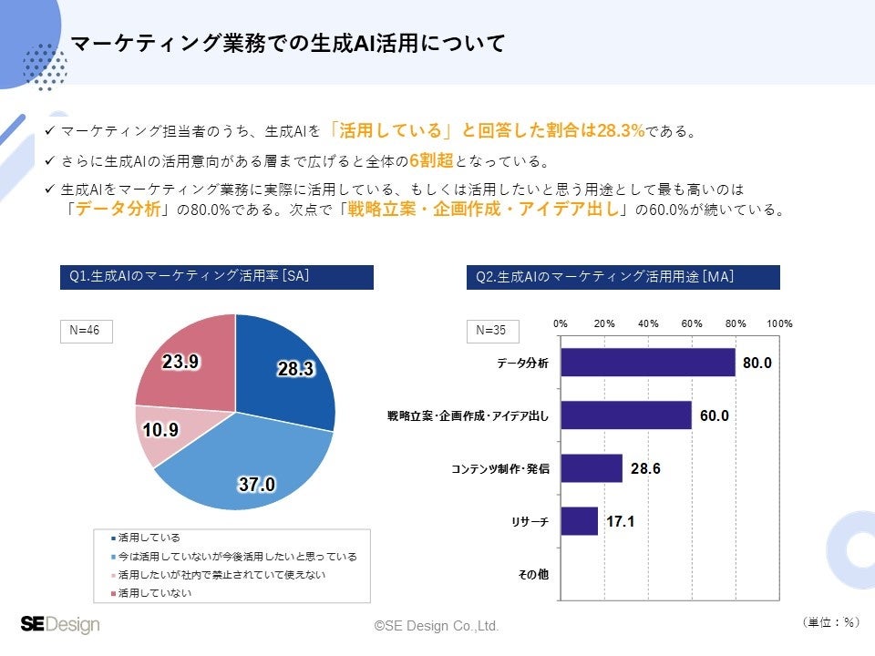 また、「Q2.生成AIをマーケティングのどの業務に活用している、もしくは活用したいと思っていますか。 あてはまるものを全てお知らせください。(複数回答)」(n=35)と質問したところ、「データ分析」という回答が最も多く、80.0%でした。