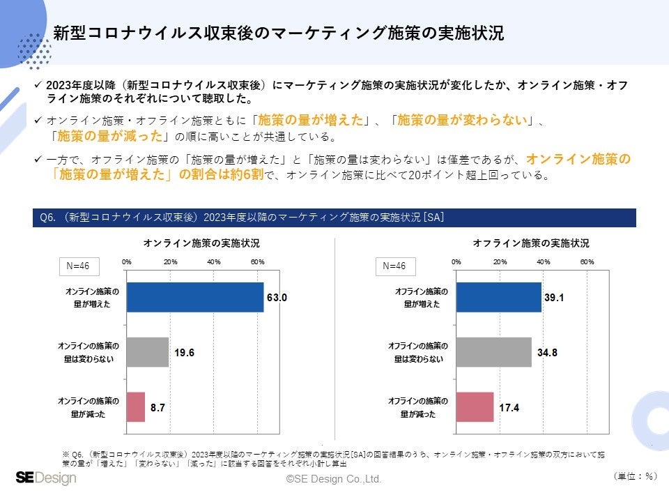 「Q6.(新型コロナウイルス収束後)2023年度以降のマーケティング施策の実施状況について、オンライン施策とオフライン施策の観点から教えてください。(単一回答)」(n=46)と質問したところ、オンラインは63.0%、オフラインは39.1%が「施策の量が増えた」と回答しました。