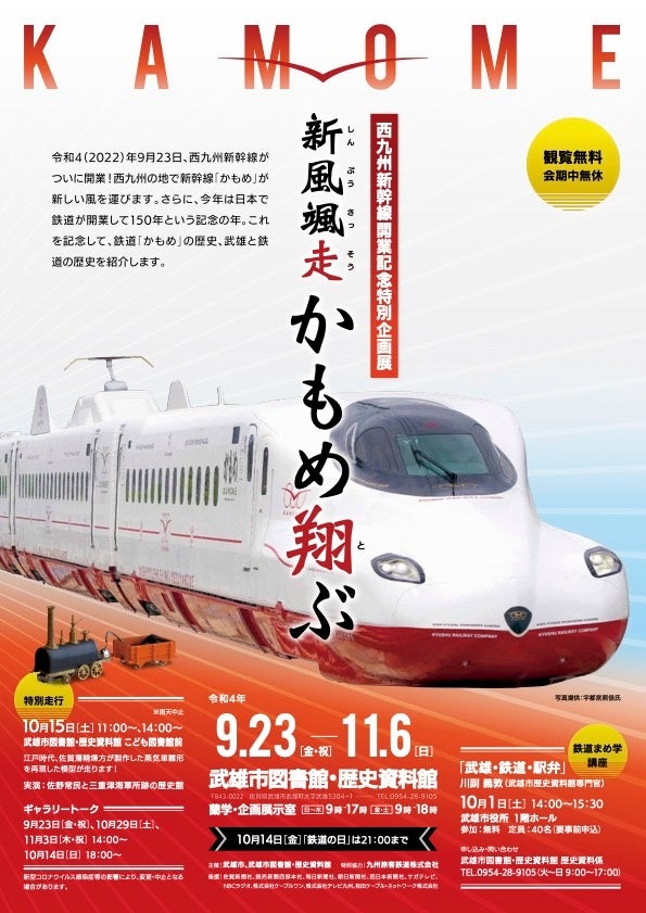西九州新幹線がついに開業!これを記念して「かもめ」の歴史や武雄と鉄道の歴史について紹介する大展覧会を開催します。期間中には『特別企画!鉄道まめ学講座』、学芸員による分かりやすい!展示解説(ギャラリートーク)も行います。