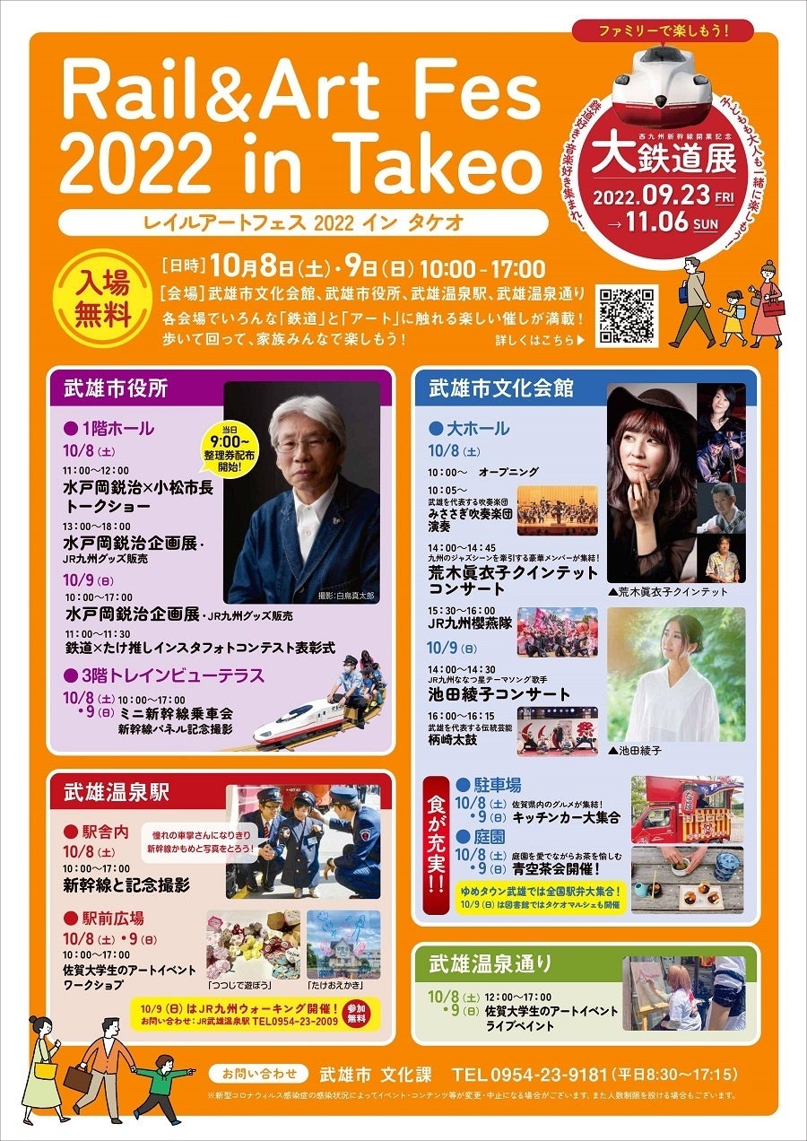 佐賀県武雄市では、令和4年9月23日(金・祝)より、西九州新幹線開業(武雄温泉駅~長崎駅間)を記念し、「この秋、武雄は鉄道でハジケる!」をキャッチコピーに、鉄道とアートを楽しむイベントを多数企画する「大鉄道展」を開催します。