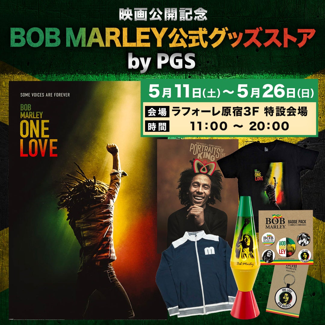 日本最大の音楽・映画・ドラマ・スポーツ・アニメ公式グッズストア「PGS」を運営する株式会社JAMSHOPPINGは、ボブ・マーリーの公式ライセンス商品を販売する『BOB MARLEY公式グッズストア by PGS』を、5月11日(土)より東京・ラフォーレ原宿3F特設会場で開催いたします。