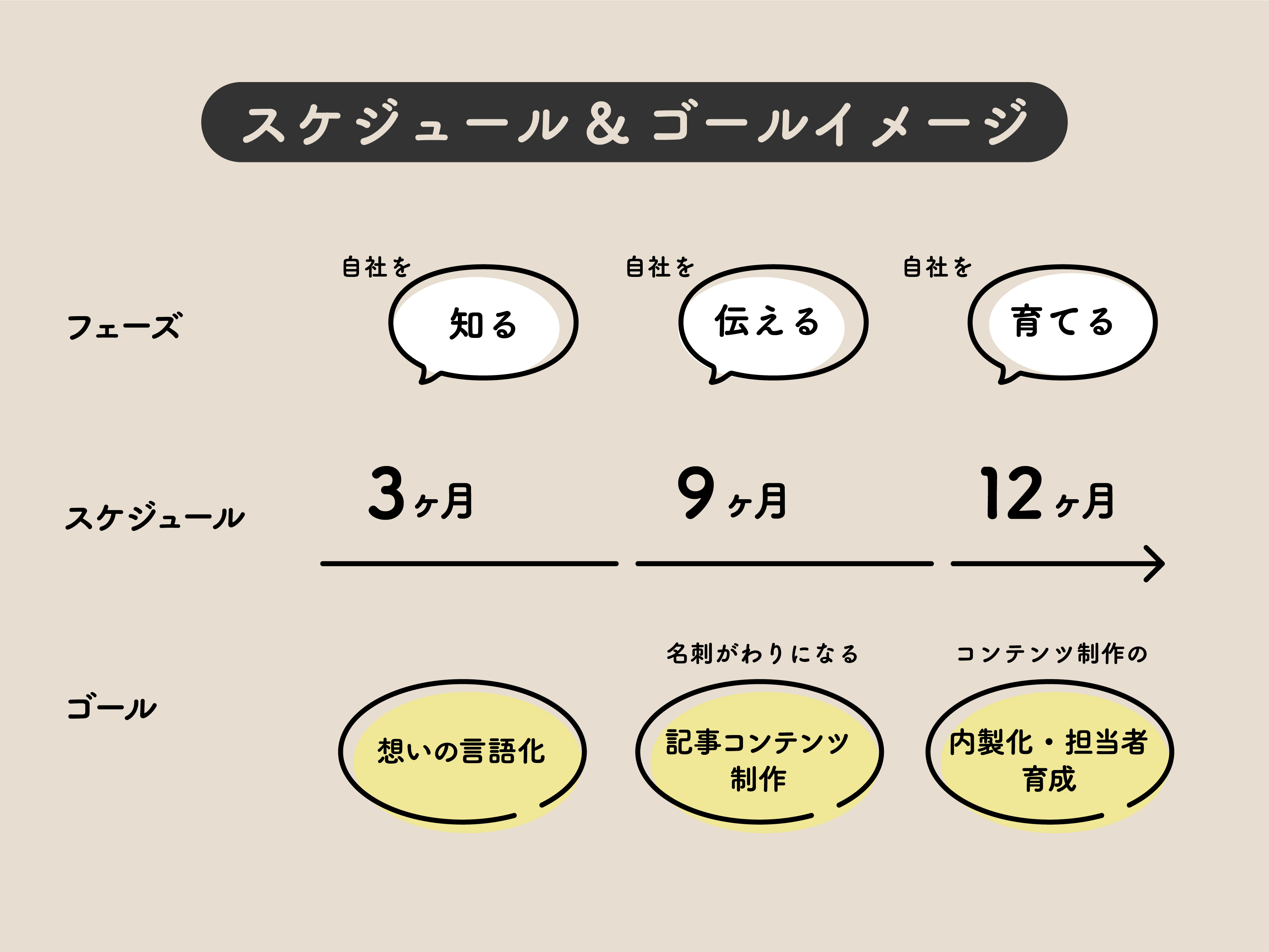 ※リリースや企画書の作成類は、最初の1〜2ヶ月で一緒に実施し、3ヶ月め以降は社内で作成できるようになるプログラムです。プログラム完了まで、サポートを実施します。