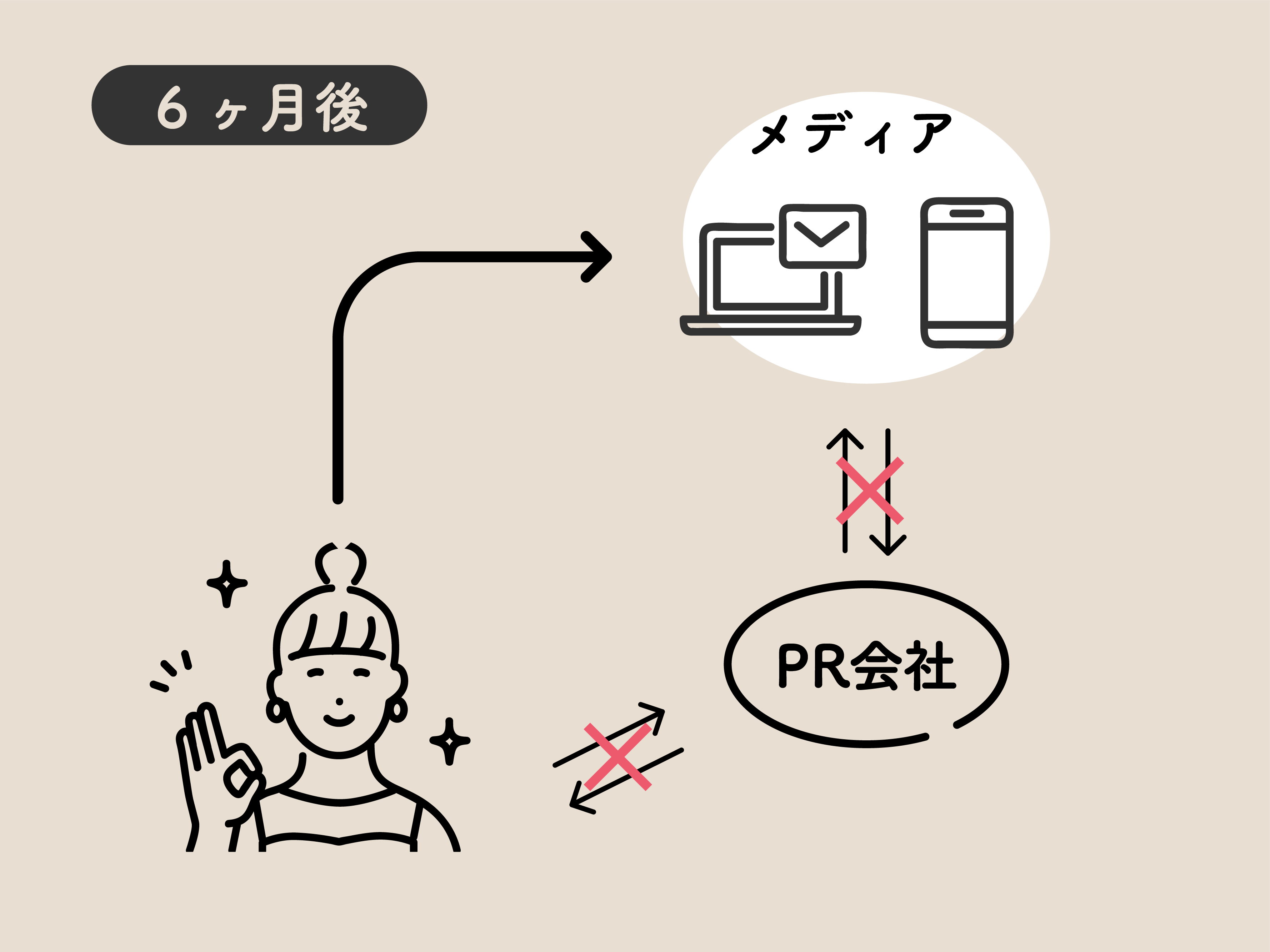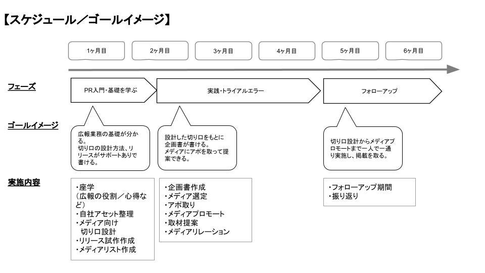 さらに、クライアントの規模や状況によっては「広報活動を外部にお願いしたくてもできない」等の制約をお持ちのクライアントにお会いしてきました。そこで当社は、広報ノウハウを自社で内製化していただくことにより、クライアントの「代わり」に実行するのではなく、半年後にはその担当者が自分のプロジェクトとして成果が出せるように、持続的に広報活動ができるようにと願って、今回のサービスを考案しました。