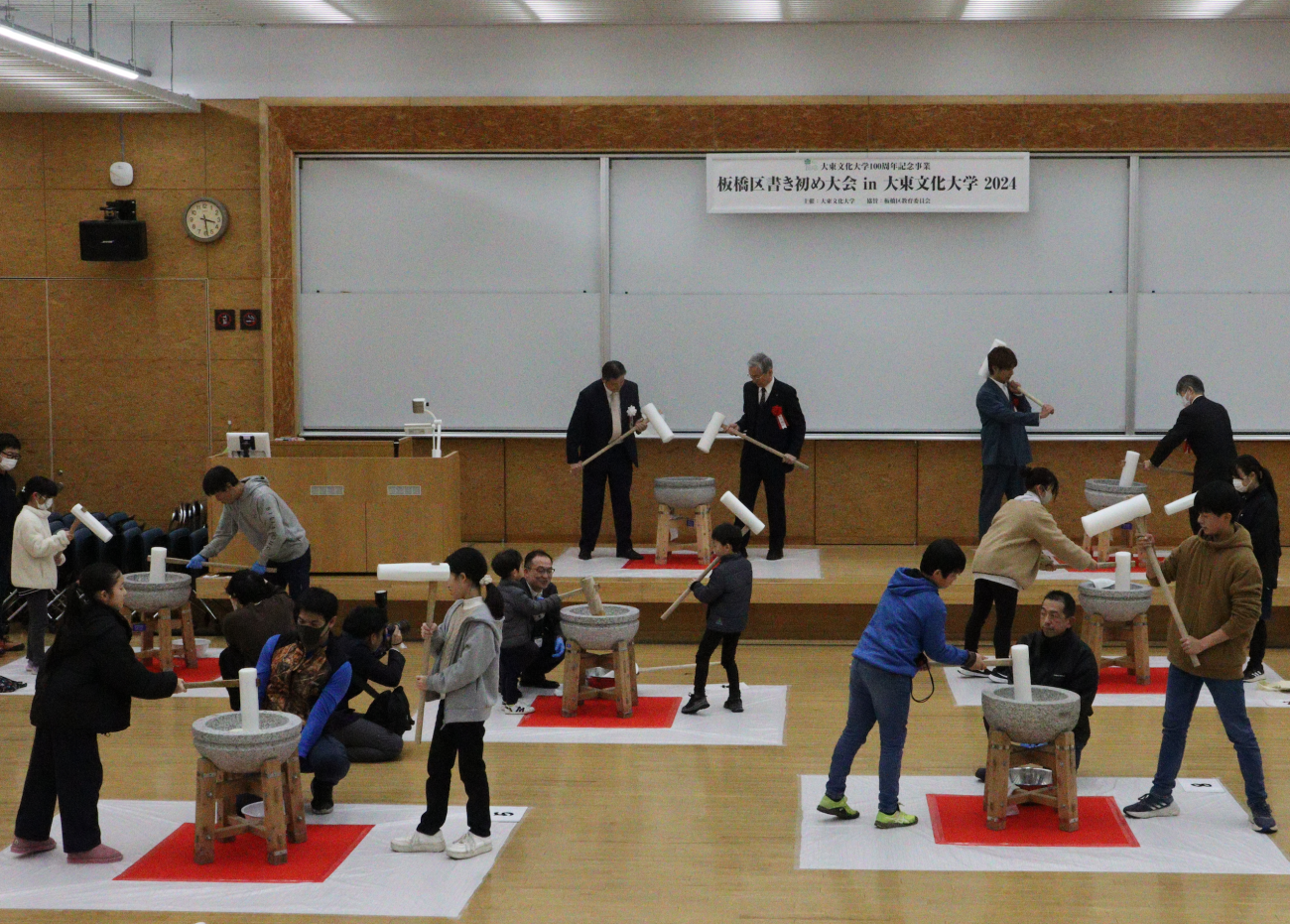 また、書き初め大会後には、同じく日本の伝統文化である「餅つき」を初の試みで行い、事前に募った参加希望者が想定上回り抽選となった。ついた餅は衛生的な観点から配布せず、餅つき参加者と事前希望した方に本学オリジナル商品「大東まんじゅう」を配布した。