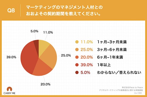 「Q8.マーケティングのマネジメント人材とのおおよその契約期間を教えてください。」(n=100)と質問したところ、「1ヶ月~3ヶ月未満」が11.0%、「3ヶ月~6ヶ月未満」が25.0%という回答となりました。